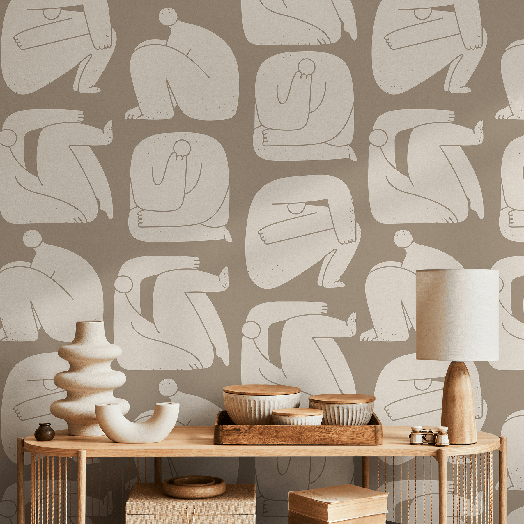 Abstract Wallpaper with Stylized Human Figures in Taupe and Beige - C242