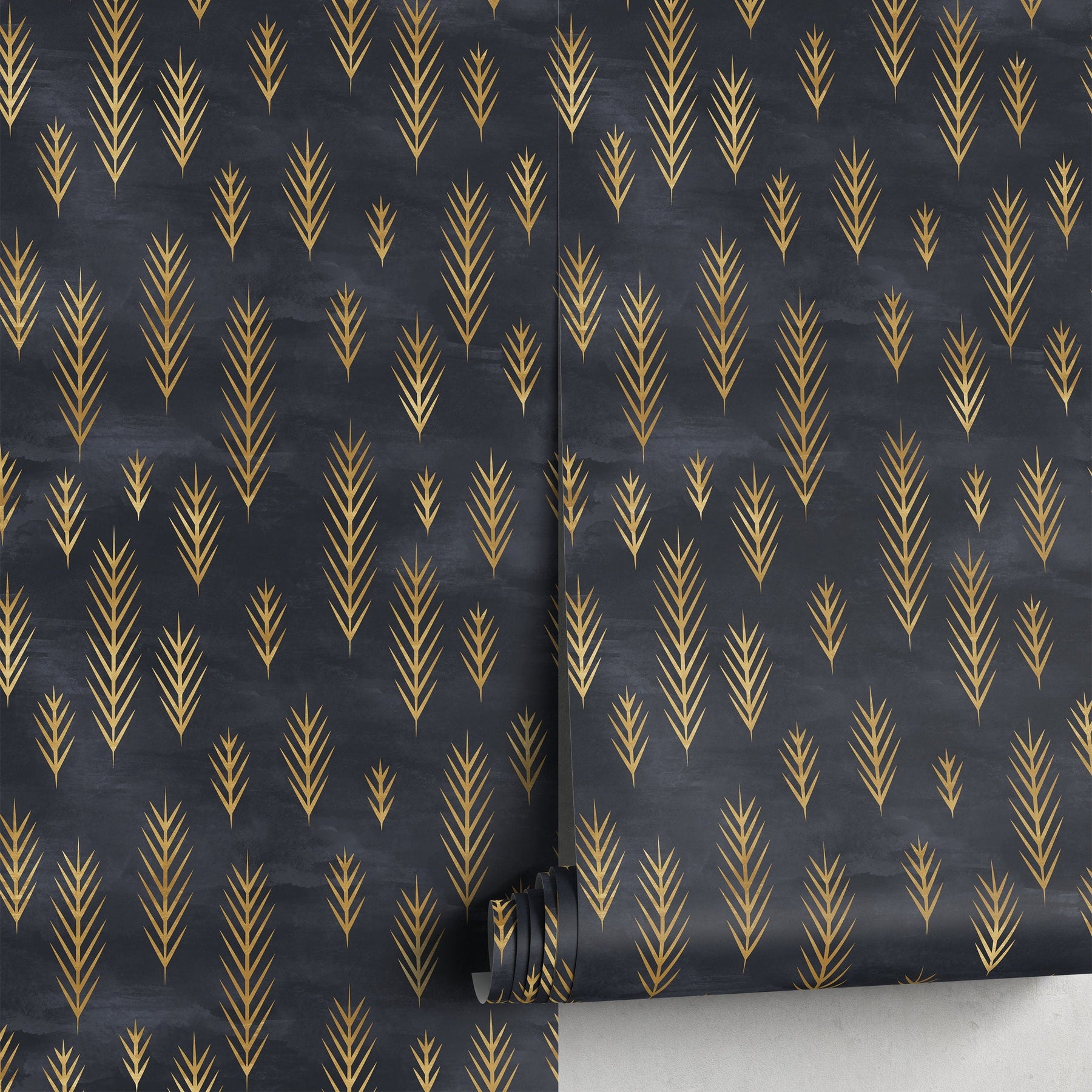 Introduce a touch of timeless elegance to your home with this stunning Art Deco Wallpaper. Featuring stylized golden fronds set against a dramatic black background, this design brings a sophisticated and luxurious feel to any interior. This Black and Gold wallpaper is the perfect choice for creating a bold statement wall or transforming an entire room with its captivating wall art. Our peel and stick wallpaper makes updating your home decor easier than ever. This removable wallpaper is perfect for renters or anyone who loves to frequently refresh their style. Ideal for a living room accent wall, a chic bedroom, or a glamorous powder room, this versatile wall decor elevates your interior design effortlessly. The easy installation process means you can achieve a professional look without the hassle. Crafted in the USA using premium, eco-friendly materials and non-toxic, VOC-free inks, our wallpaper is not only beautiful but also safe for your family. We use advanced printing technology to ensure vibrant color consistency and superior scratch resistance, guaranteeing your wall art remains flawless for years. Enjoy the confidence of a high-quality product that is both durable and easy to remove.