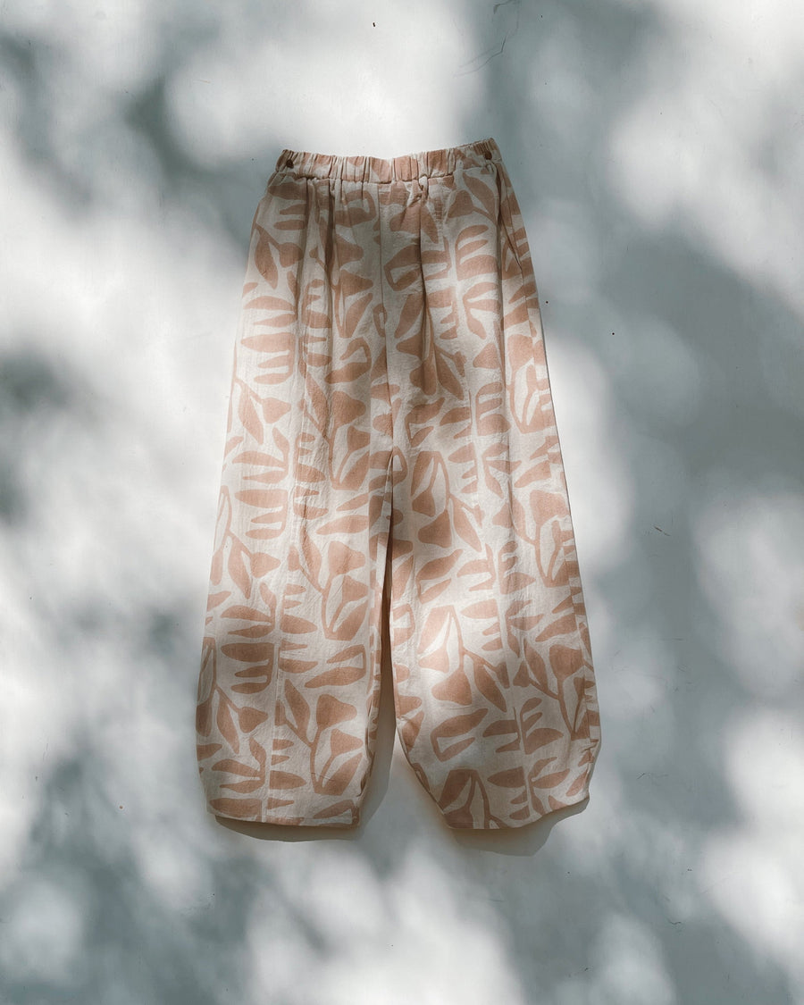 Fit: The Palace Pant in Botanical Block Print is designed for beautiful comfort and wardrobe versatility. Made from soft breathable cotton, these pants feature a slight balloon silhouette, an elastic waistband for a perfect fit, and convenient pockets.