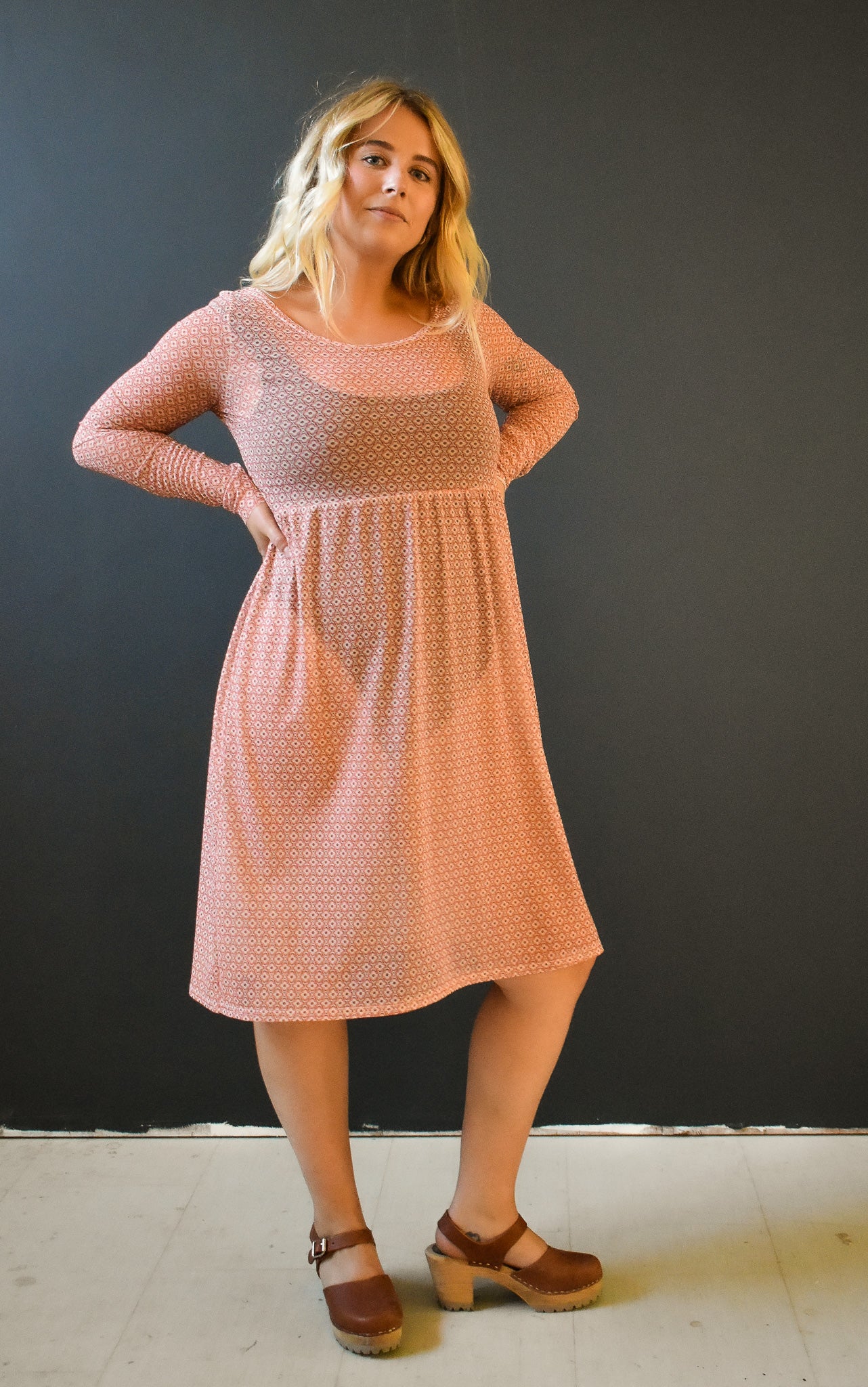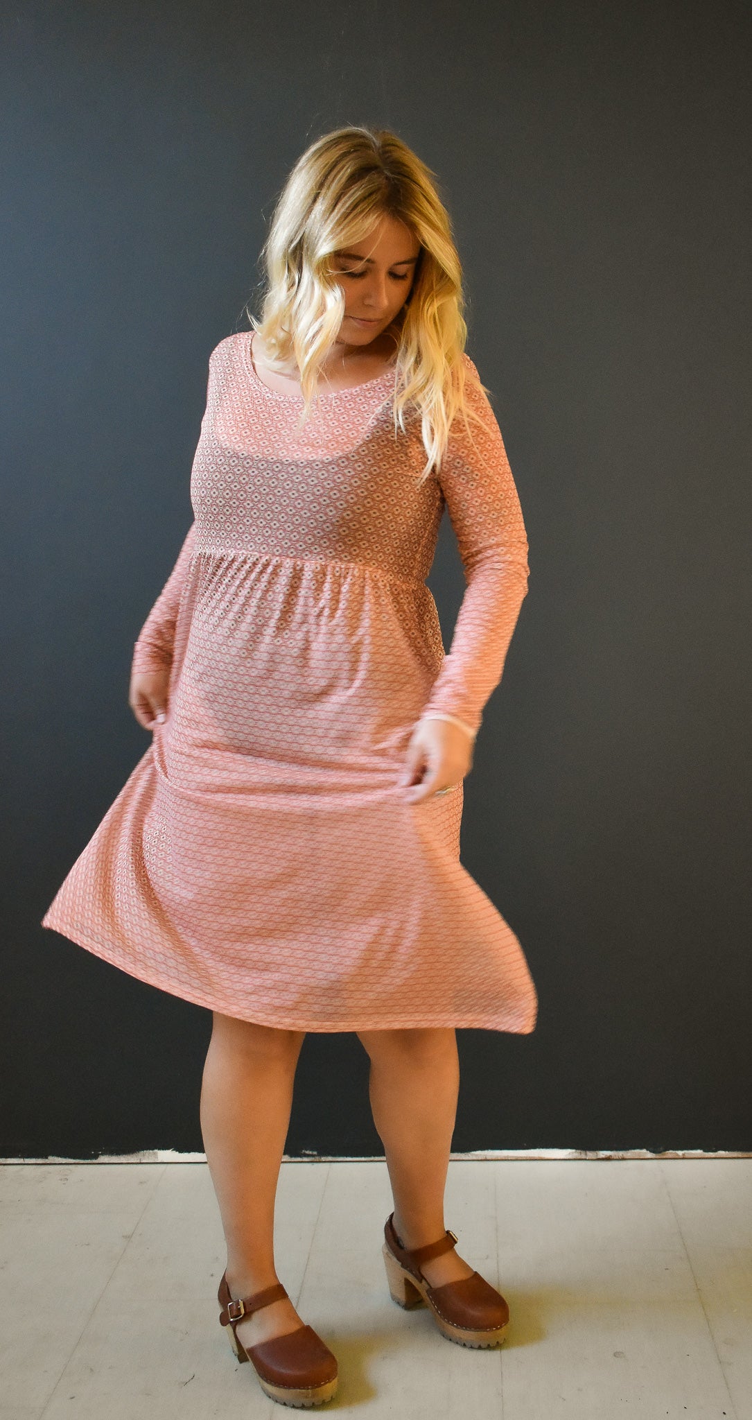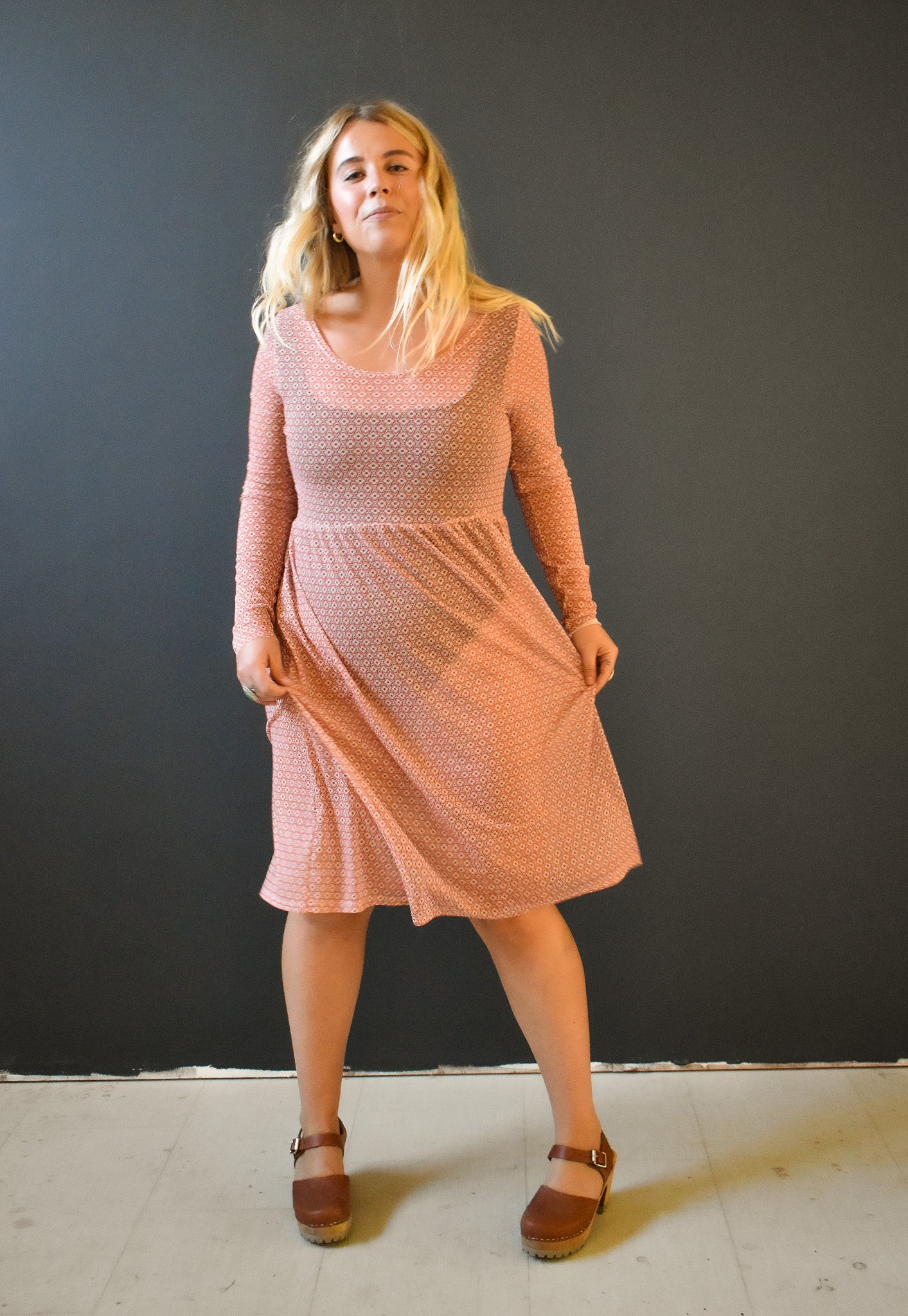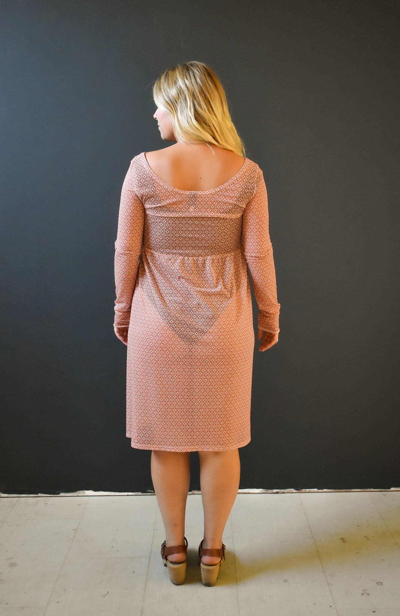 Beautiful drape and weight in the fabric, with t-length, a-line skirt and a seam at the natural waist with skinny sleeves. Low back and a boat neckline. Super chic and very versatile. This is a staff favorite.