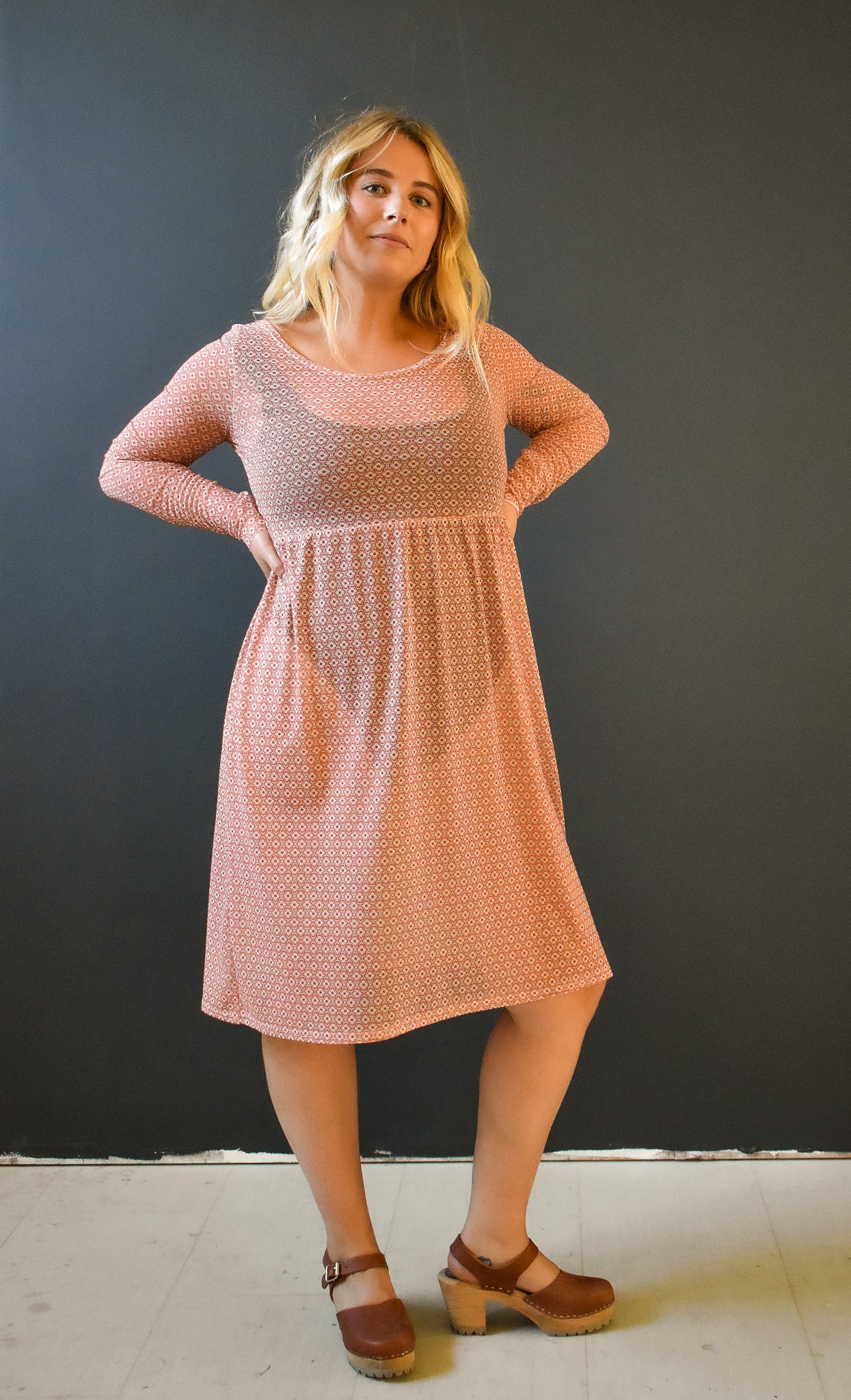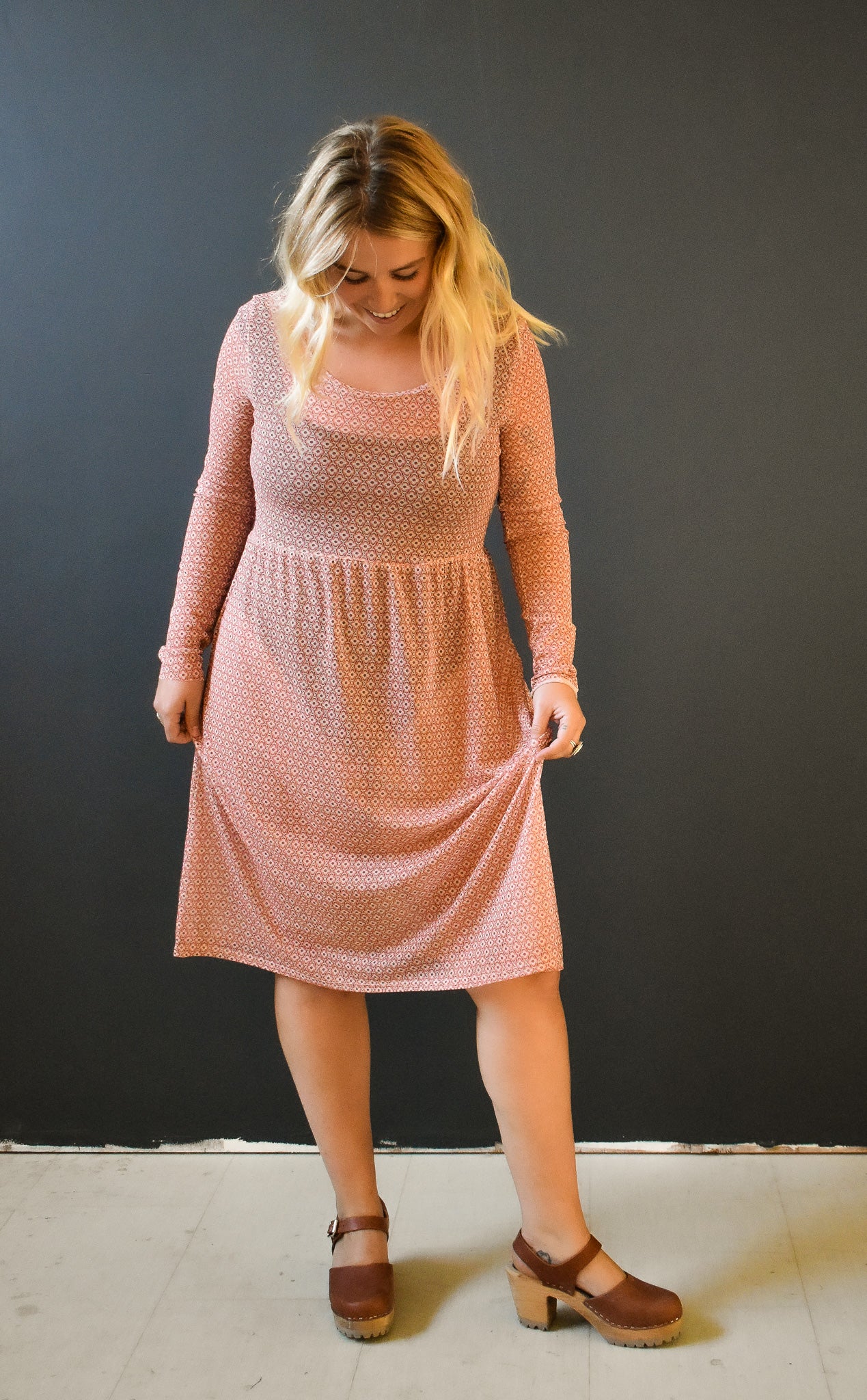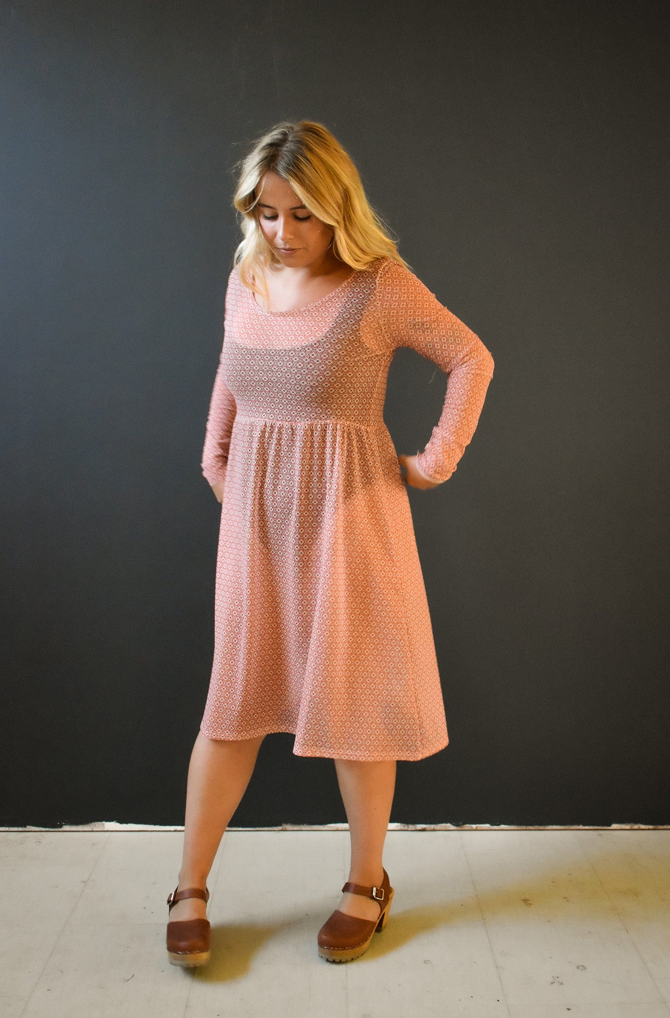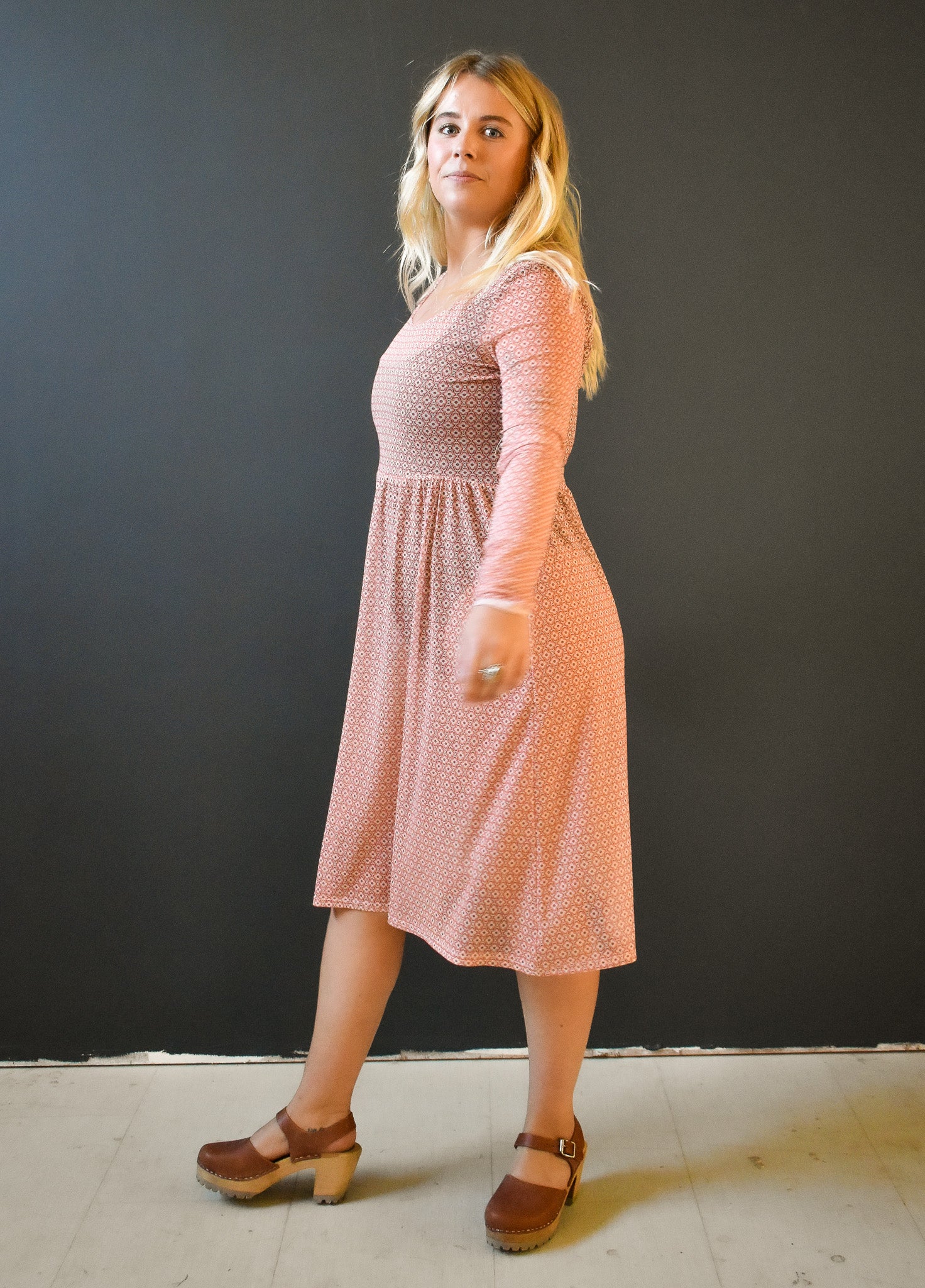 Beautiful drape and weight in the fabric, with t-length, a-line skirt and a seam at the natural waist with skinny sleeves. Low back and a boat neckline. Super chic and very versatile. This is a staff favorite.
