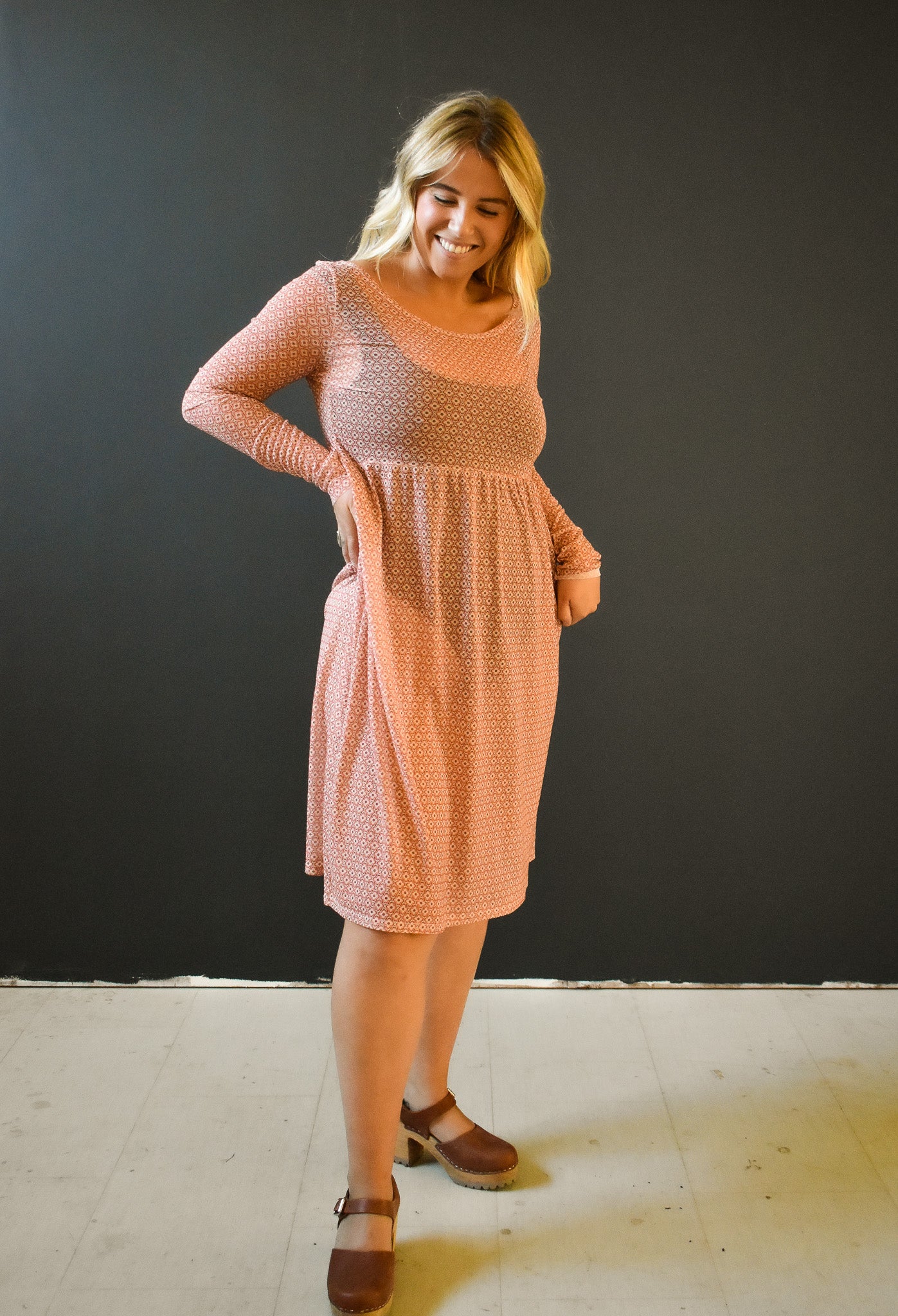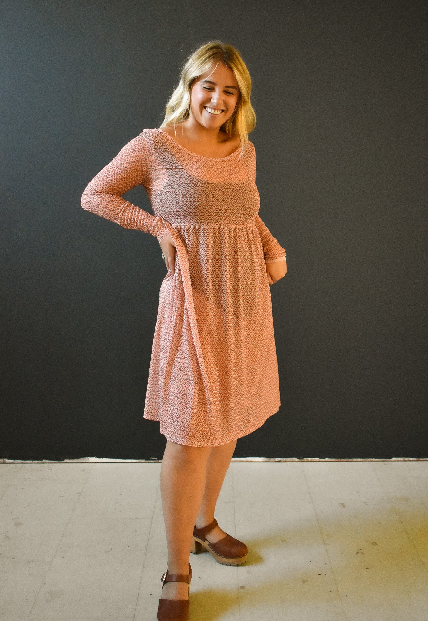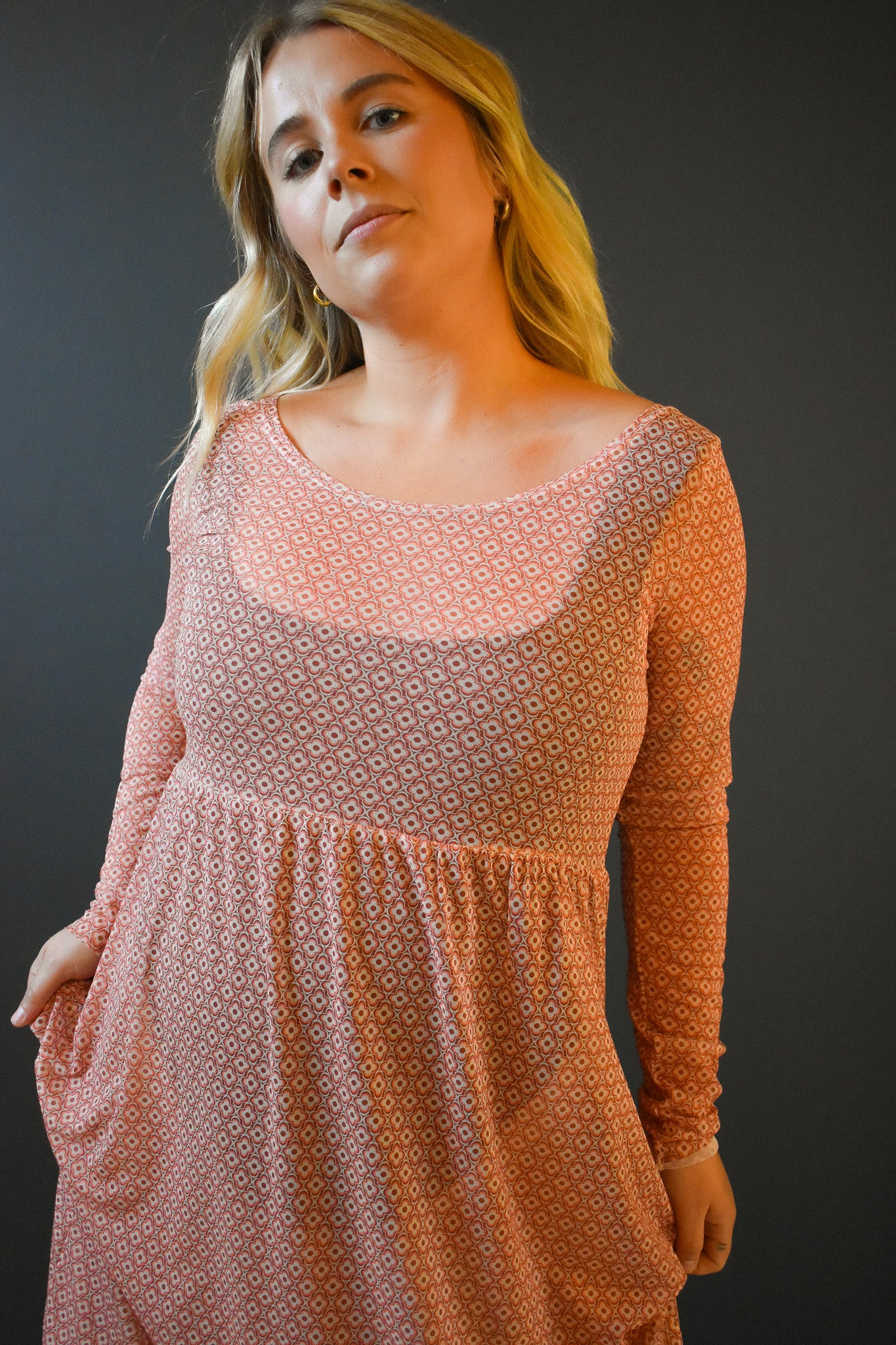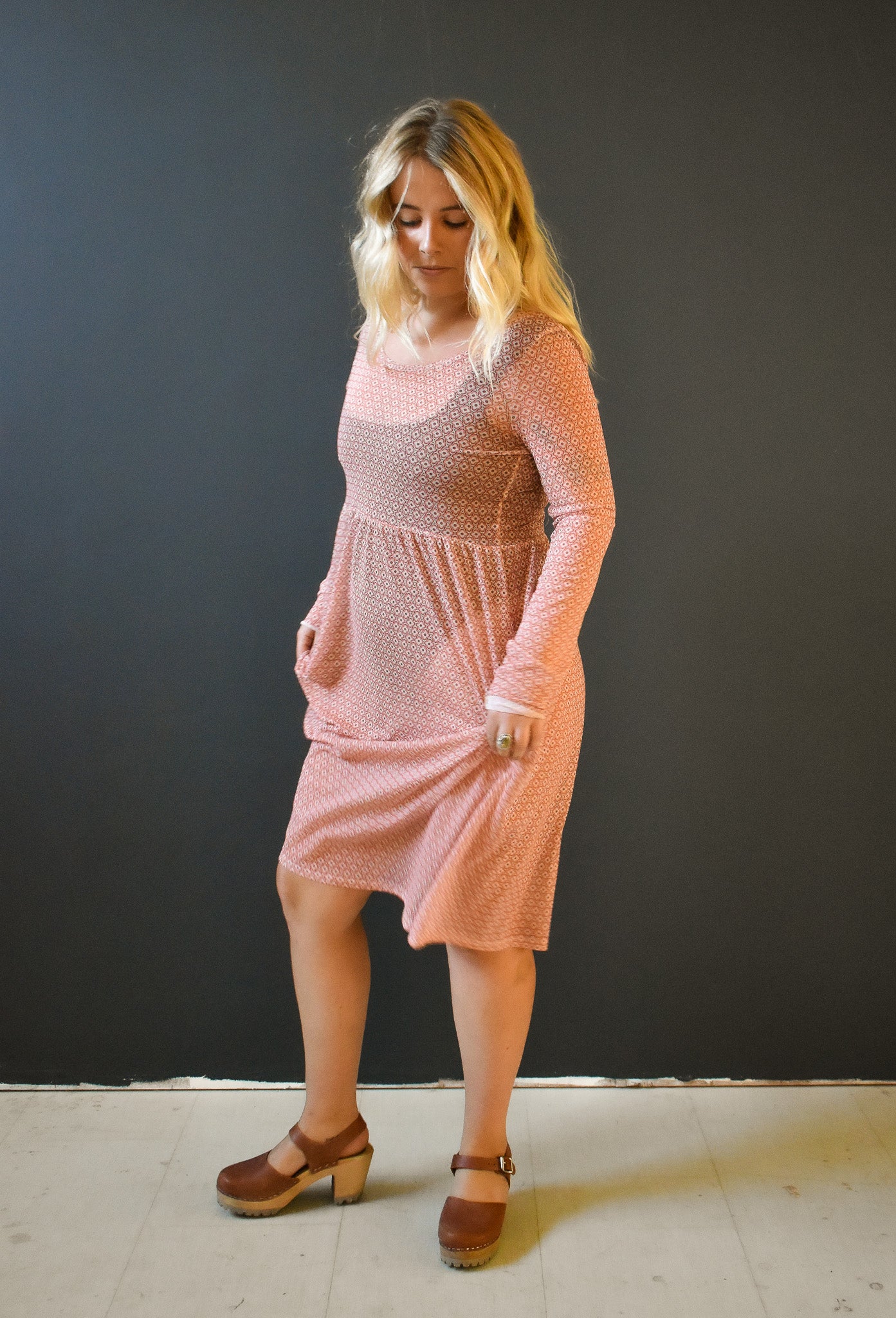 Beautiful drape and weight in the fabric, with t-length, a-line skirt and a seam at the natural waist with skinny sleeves. Low back and a boat neckline. Super chic and very versatile. This is a staff favorite.