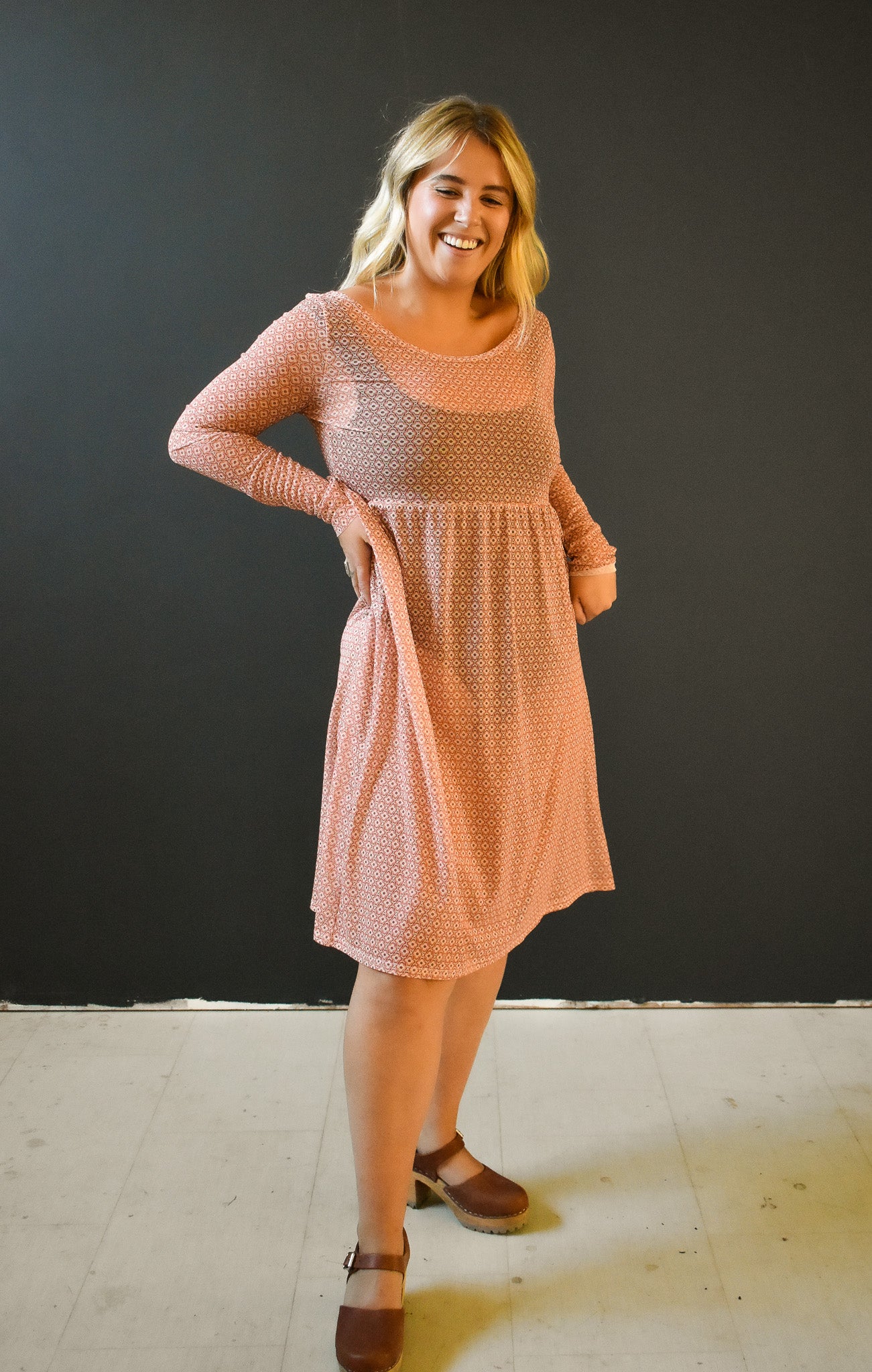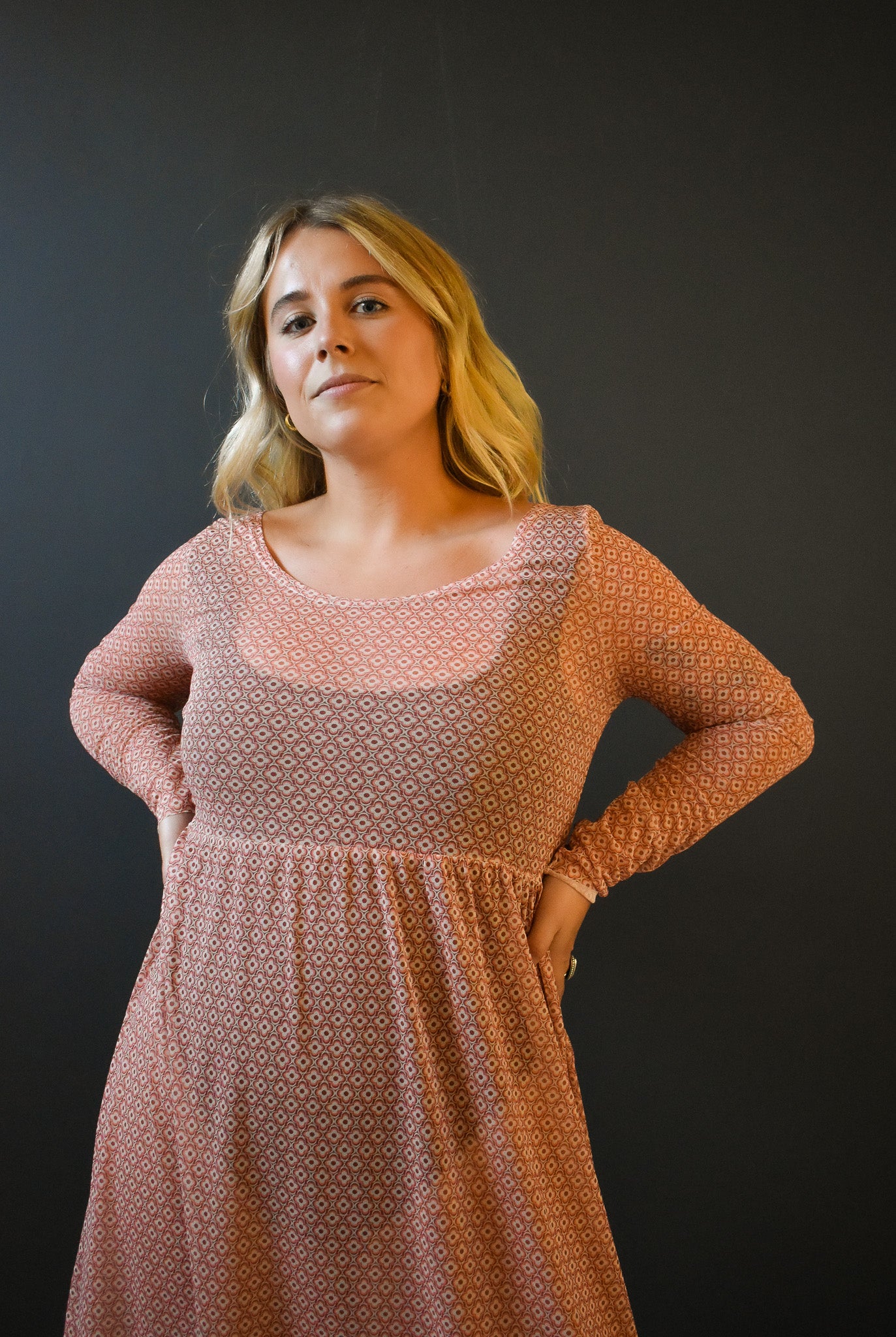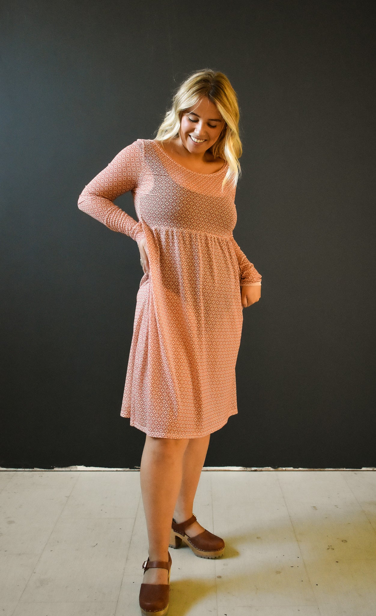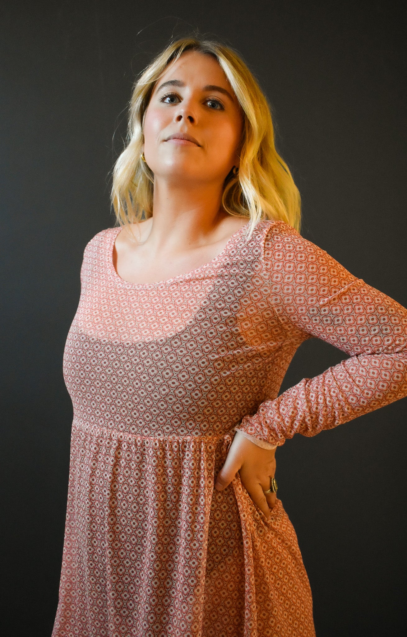 Beautiful drape and weight in the fabric, with t-length, a-line skirt and a seam at the natural waist with skinny sleeves. Low back and a boat neckline. Super chic and very versatile. This is a staff favorite.