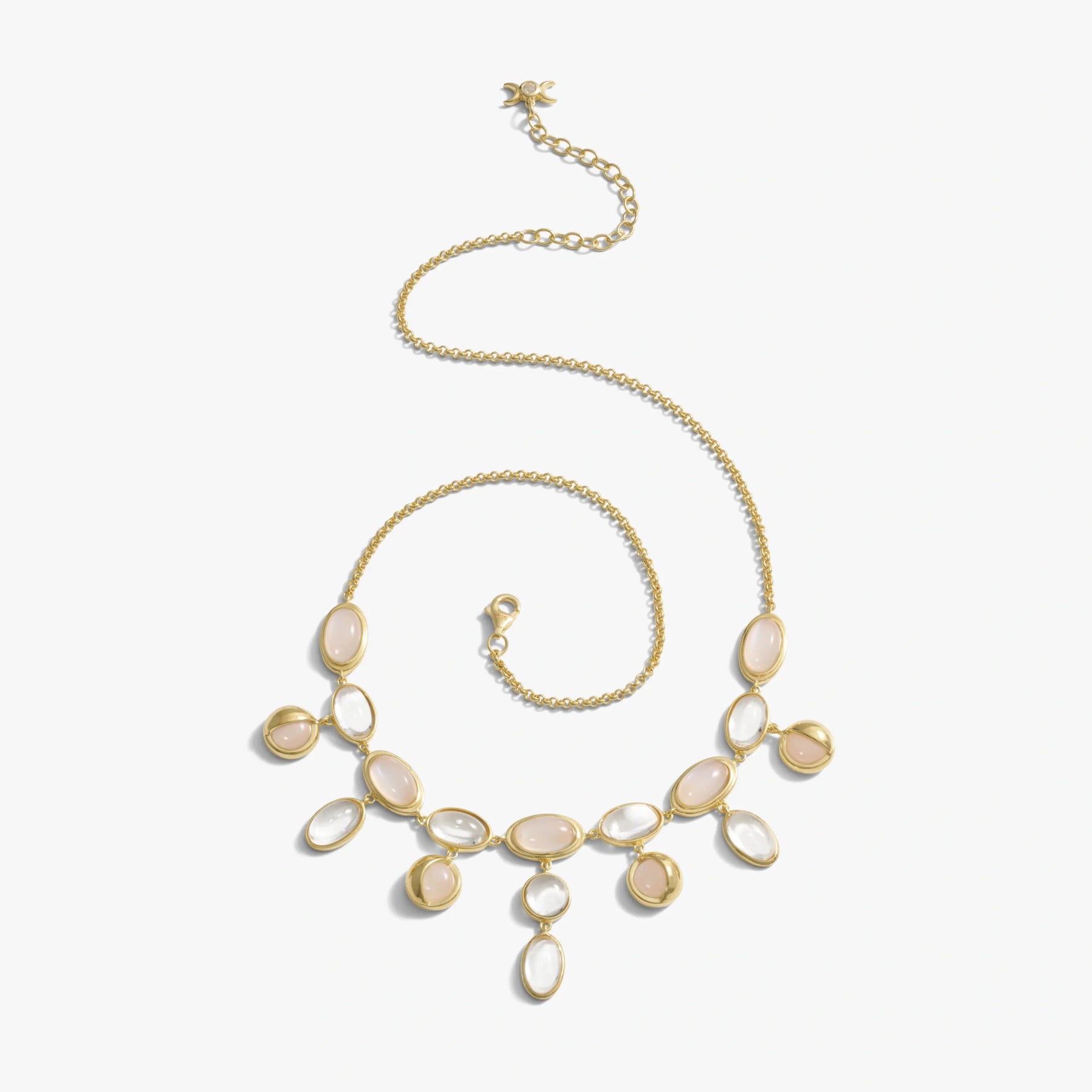 Moonstones wax and wane in their settings, as mutable as the heavenly body for which they were named. As this substantial statement collar traces the moon's journey in gemstones and quartz, its weight serves as a reassuring reminder: even with change, comes constancy.