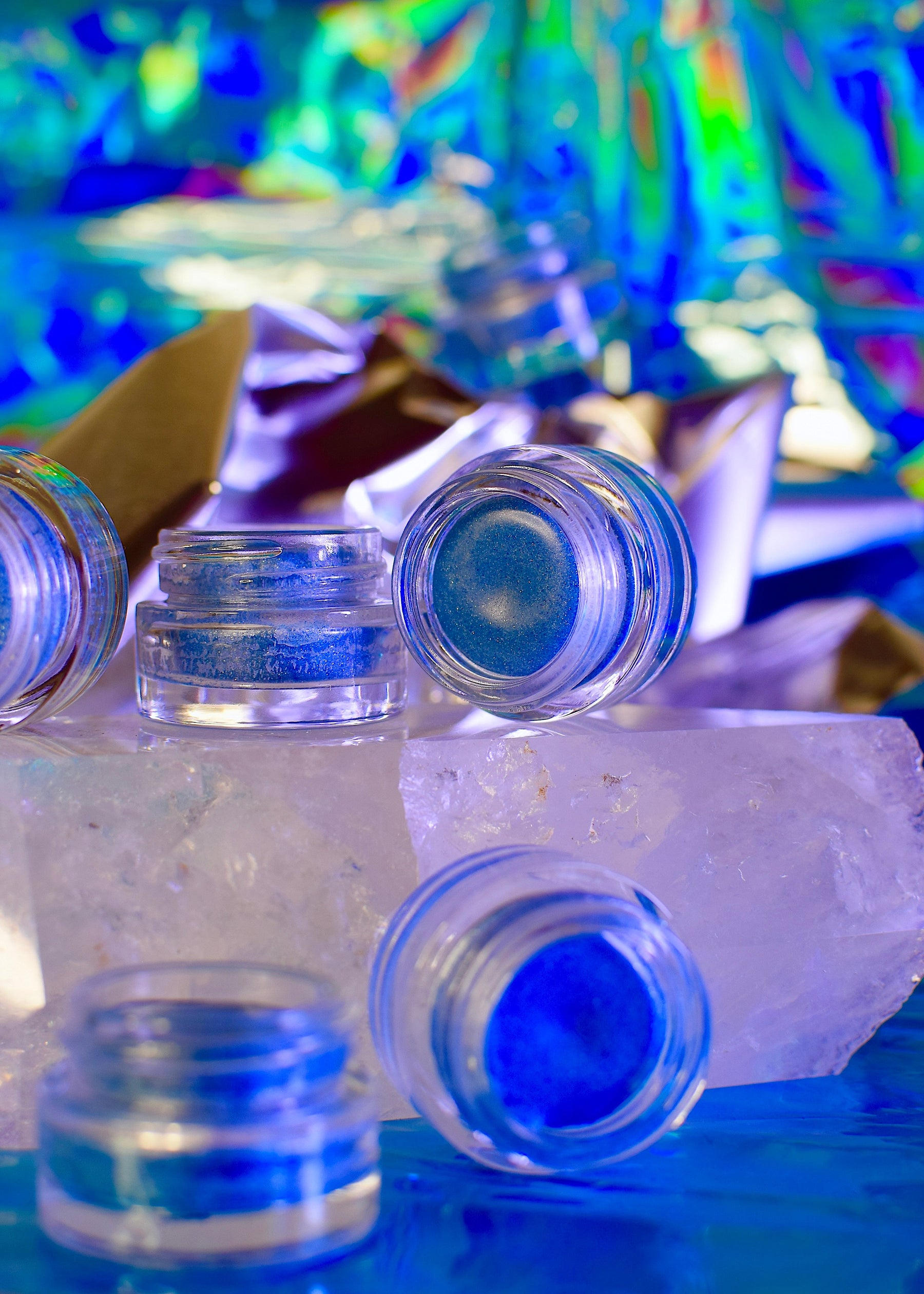 A universe of makeup highlights and endless sparkle of transparent blue hues! Intended as a makeup primer, party time gloss, cheek bone highlighter, experimental lip gloss.