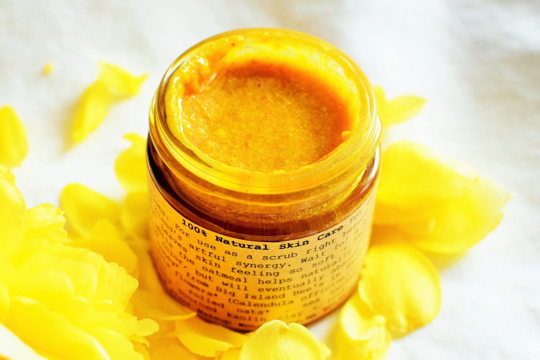 Ingredients: honey*, turmeric root* (Curcuma longa), calendula flowers* (Calendula officinalis), extra virgin olive oil* (Olea europaea), rolled oats* (Avena sativa), sea buckthorn oil*, naturally occurring kaolin clay + love. *purveyed certified organic ingredients