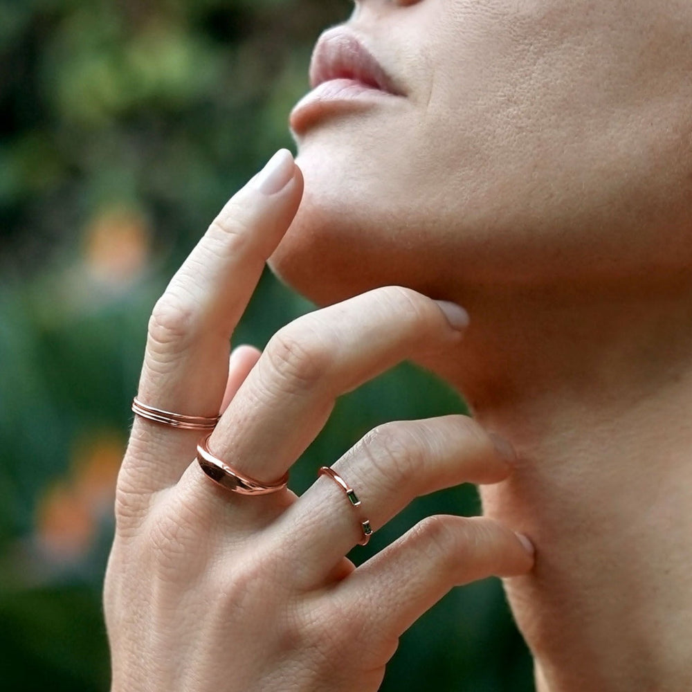 Our materials make for an amazing, high quality, seamless, jewelry piece with longevity. Our rings are plated with 18k gold, 18k rose gold, or sterling silver and finished with a protective coating. A little secret we’ll keep between us: it looks way more than it costs.