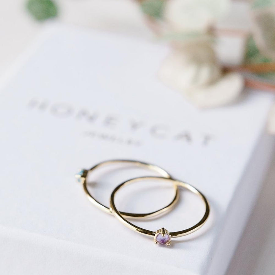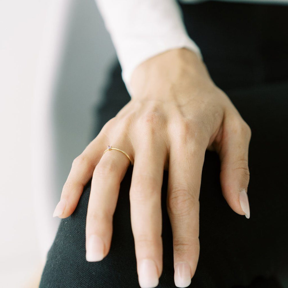 A tiny bezeled amethyst crystal delicately set upon a thin, smooth band. Gorgeous worn solo or the perfect compliment alongside a stack of skinny rings.