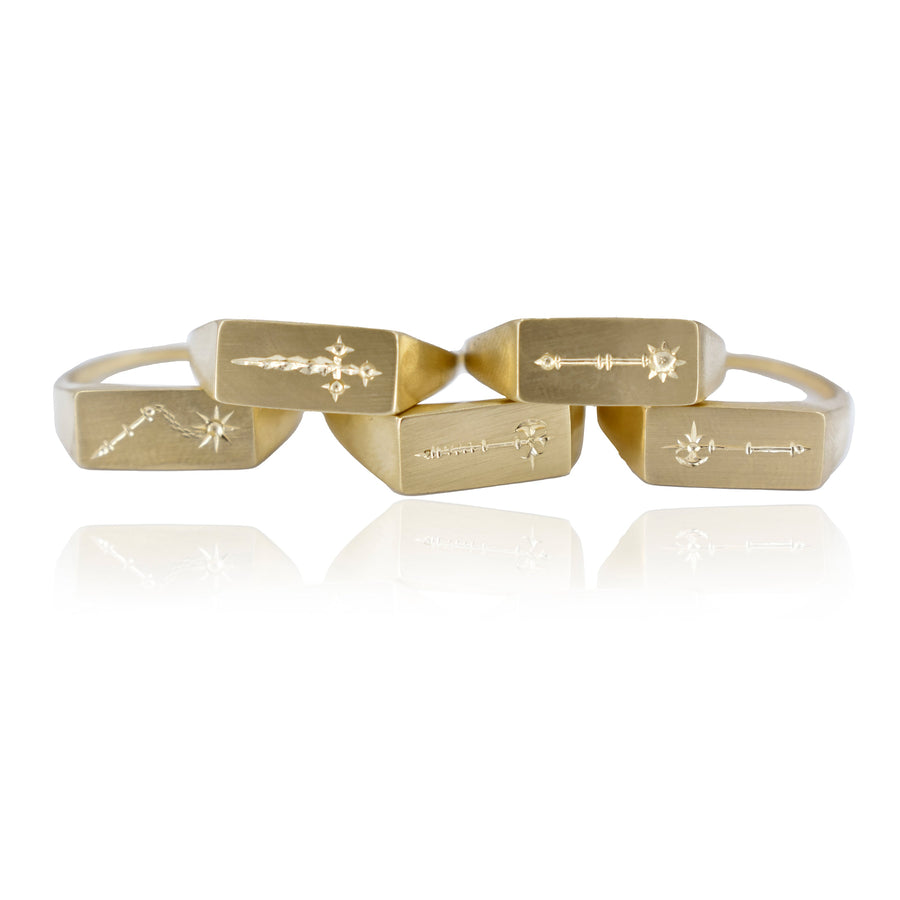 Choose Your Weapon wisely, or mix and match to create a deadly stack. These signets feature a bright cut hand engraved medieval weapon in the center. Due to the handmade nature, each weapon will vary slightly and have unique details.