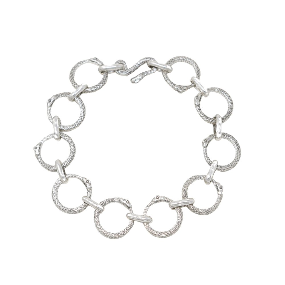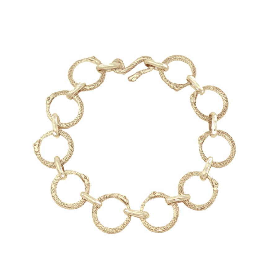 Introducing our Ouroboros Chain bracelet: A luxurious homage to ancient mysticism and eternal cycles featuring sculptural circular serpent links.