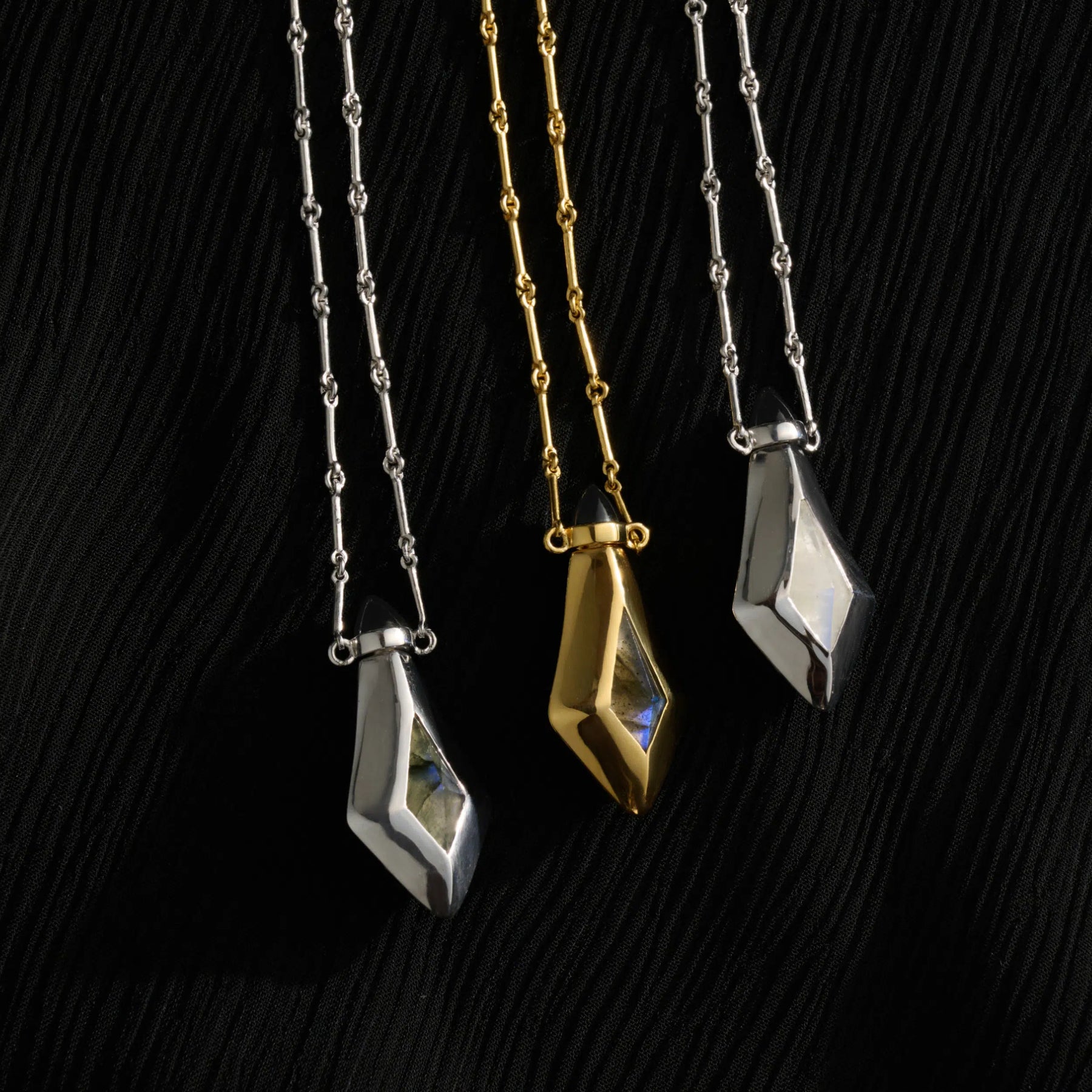 A vessel that can be opened to hold a small amount of anything you may need to carry, inlaid with a kite shaped gemstone prism. Fixed on a bar chain with a small gemstone dome lid. Choose labradorite for spiritual protection or moonstone to heighten intuition.