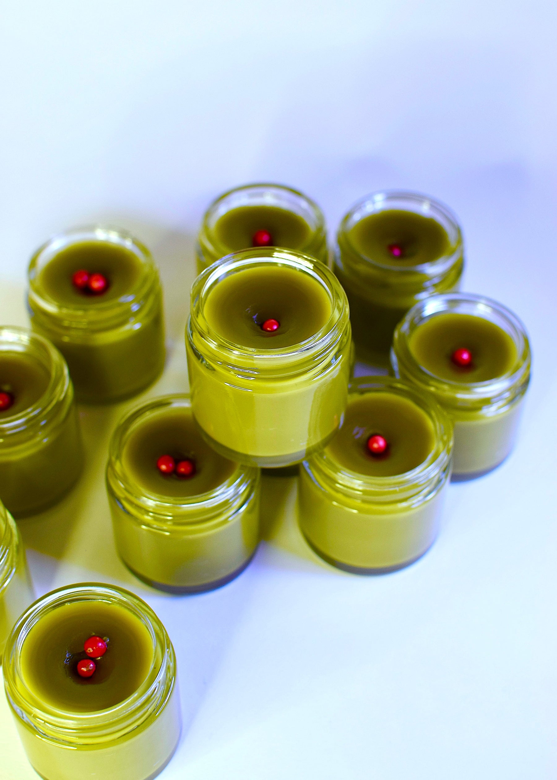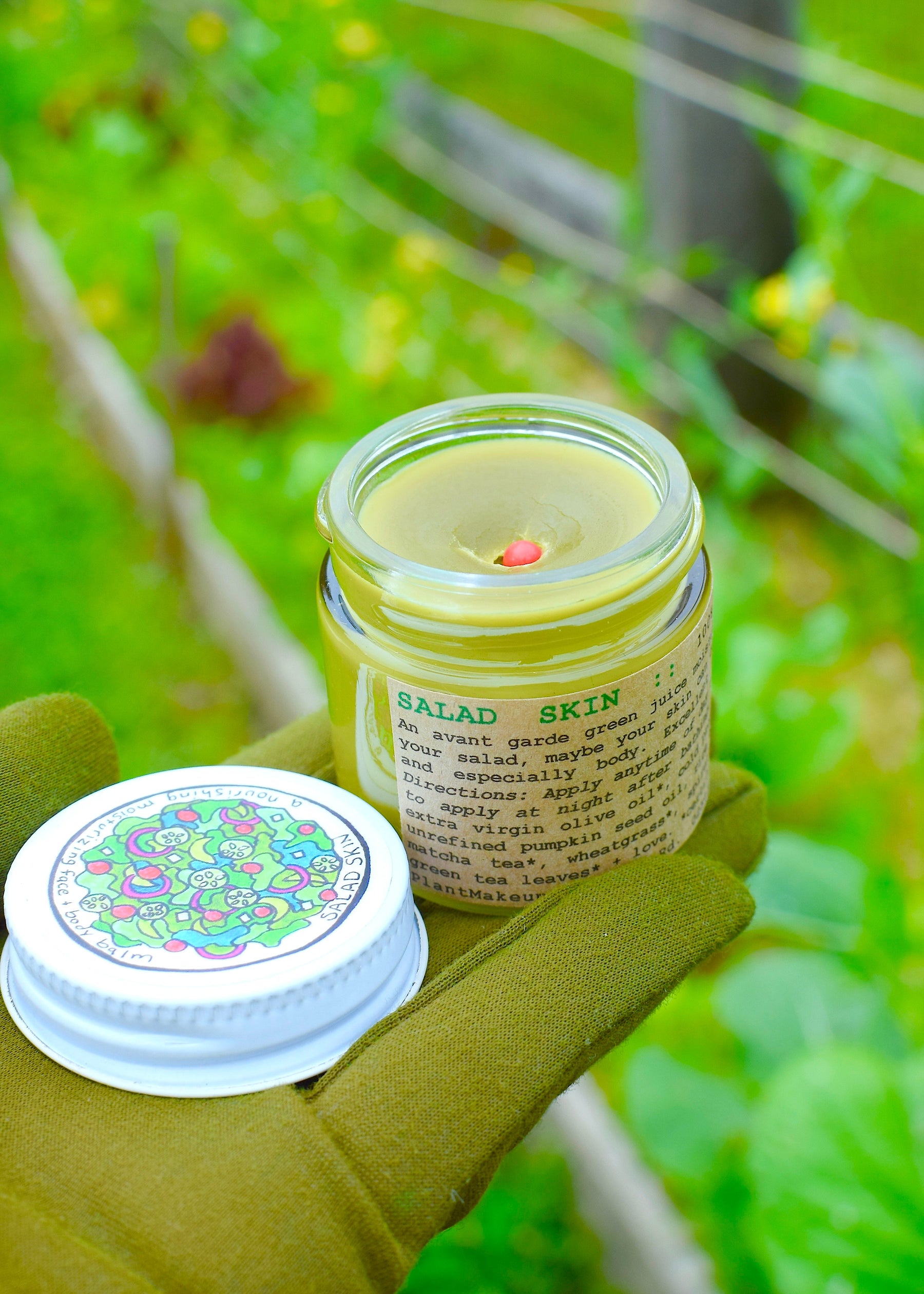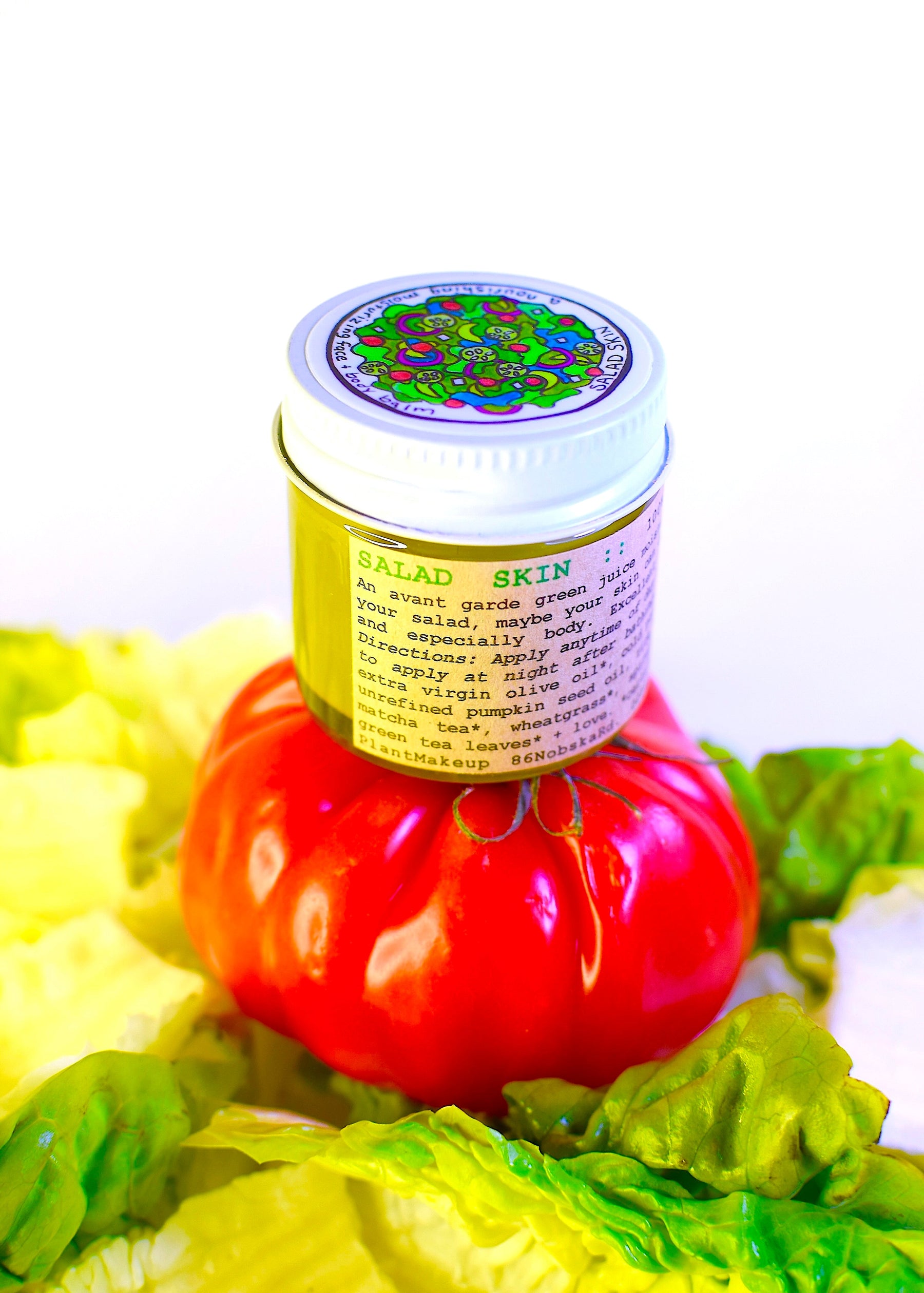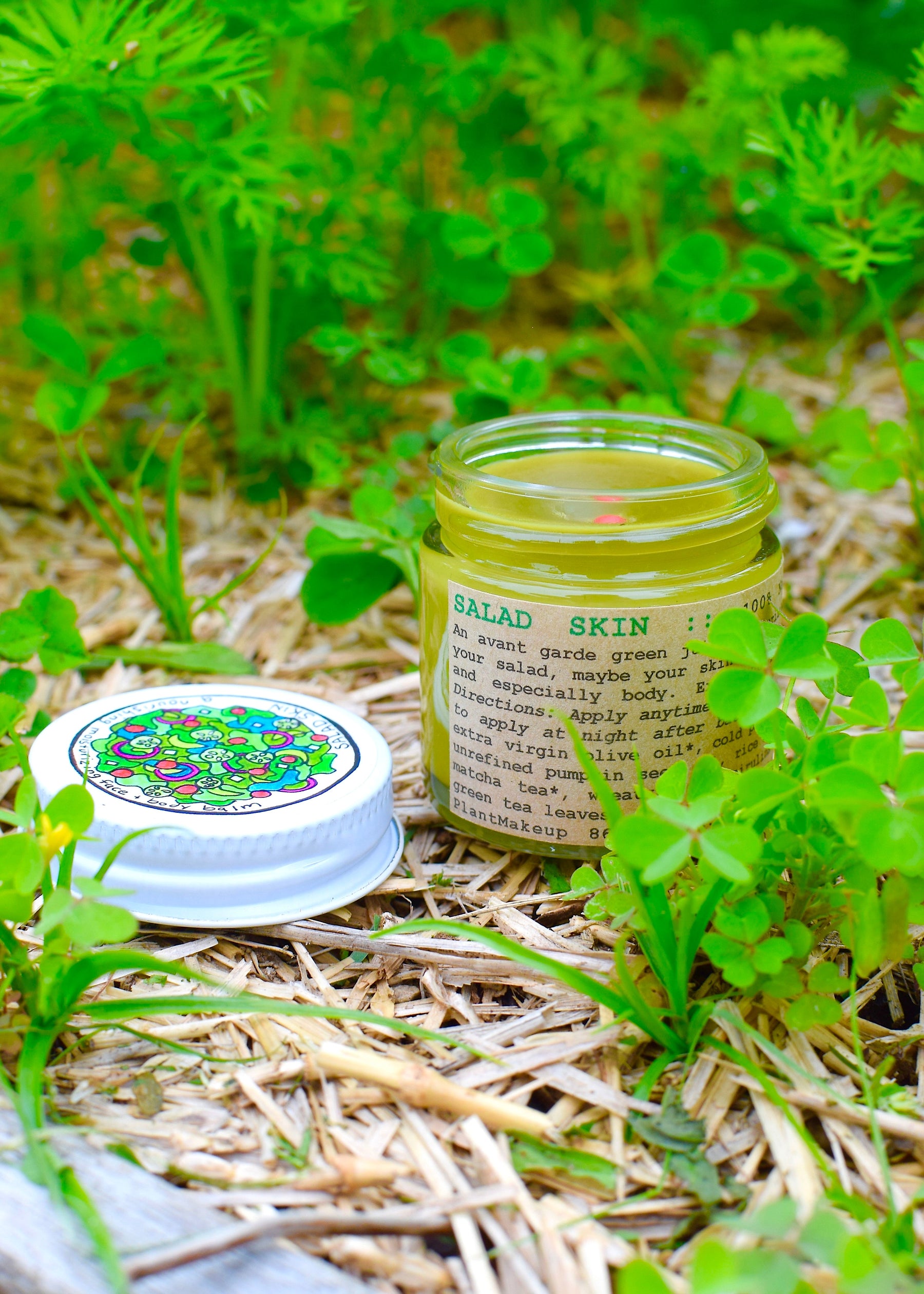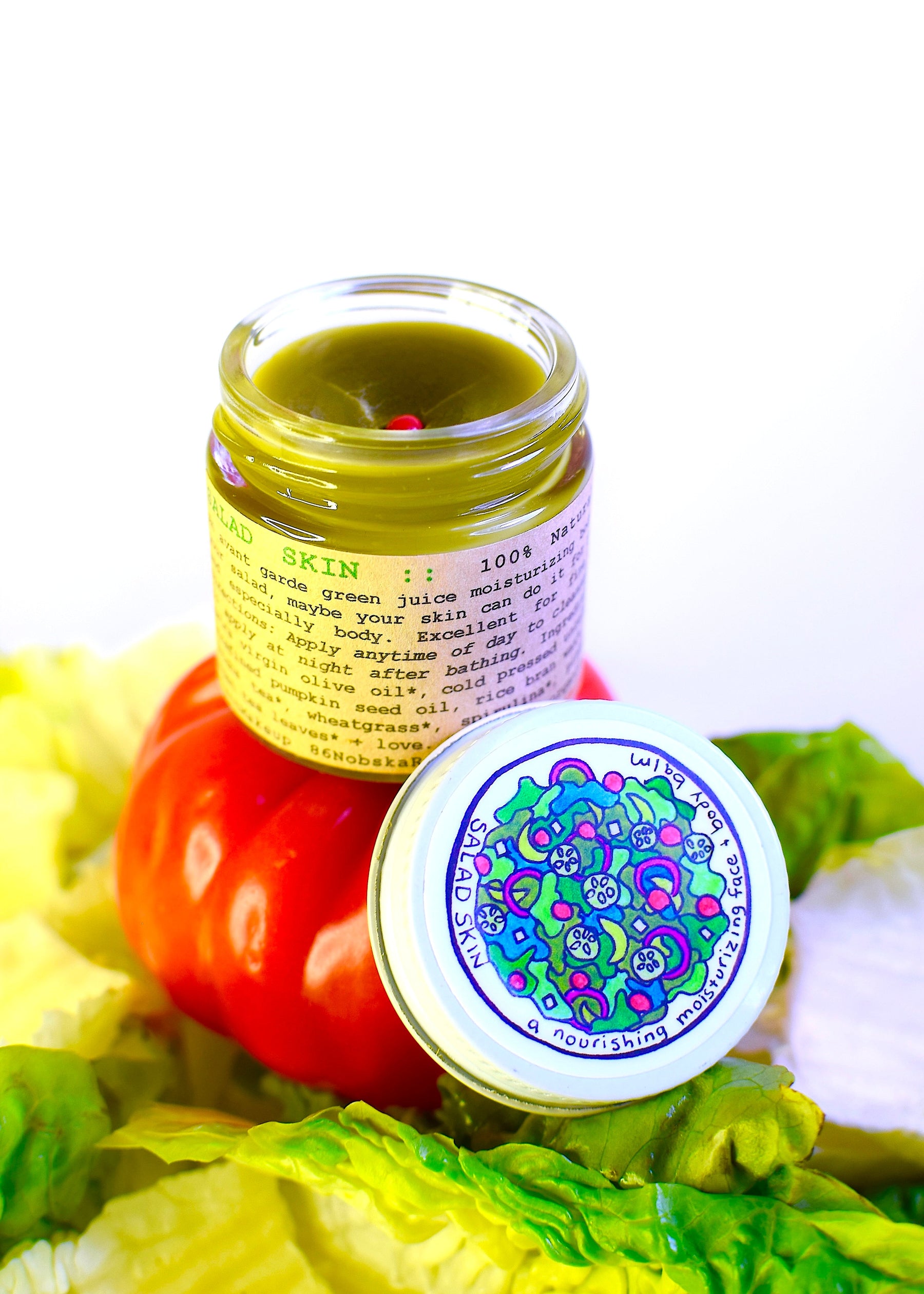 An avant garde green juice moisturizing body beauty balm. If you don't want to eat your salad, maybe your skin can do it for you! A daily moisturizer for face and especially body. Excellent for fine lines + gentle beautification.