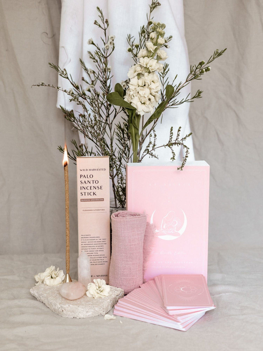 Presenting the 'Pink Goddess' Bundle: an assemblage of divine energies and insights. Immerse in the mysteries of the cosmos with our dusty pink Astrology Oracle Deck and its enlightening book. Paired with the heart-centered vibrations of rose quartz and the purifying essence of hand-rolled palo santo incense, this set is a radiant tribute to the feminine divine.