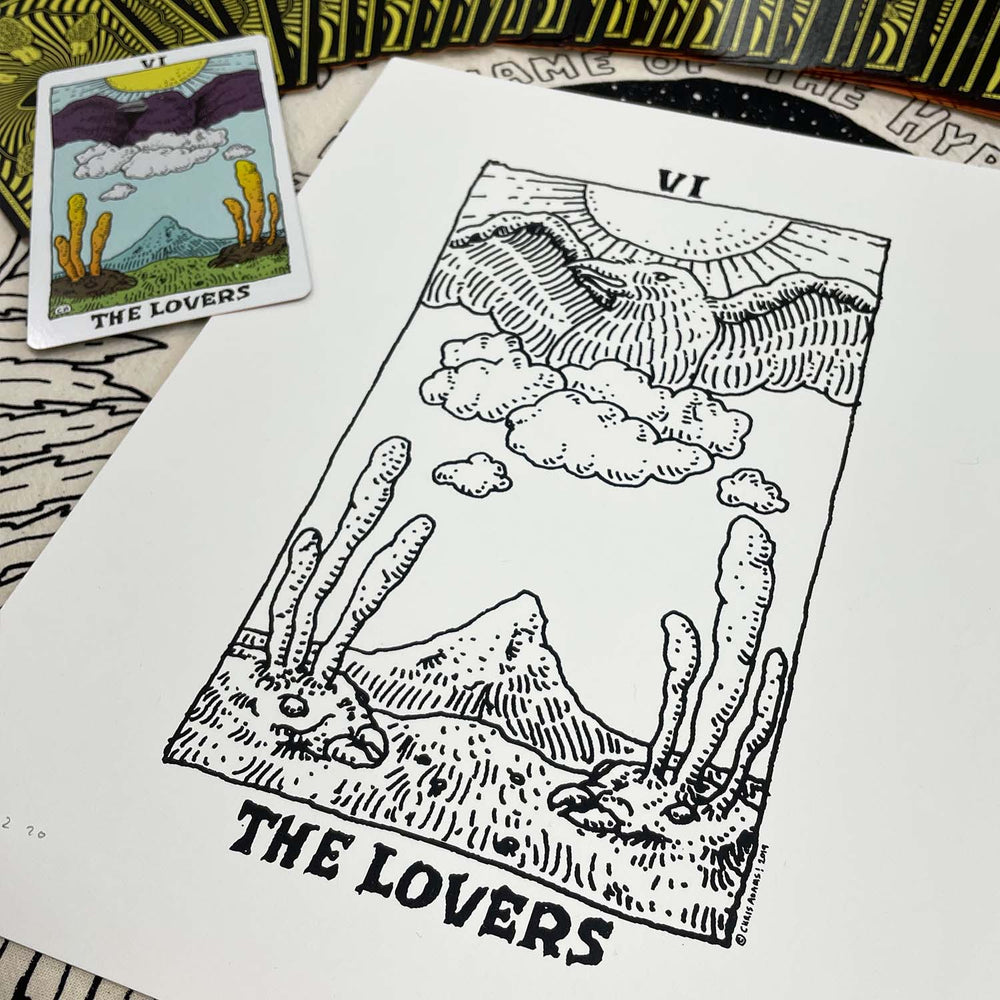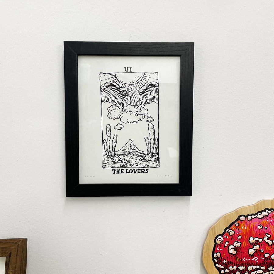 Hand Printed Silkscreen of The Lovers Card. This print features The Raven balancing light and dark from the sky above while Cordyceps Mushrooms engage in the ultimate act of love. Fusing their future with that of their host, they inhabit insects, control their minds, and finally burst forth to send their spores into the wind––starting the process once again.