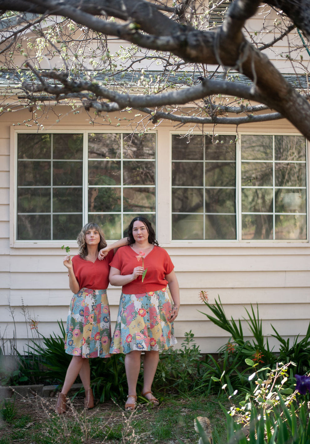 The Bae Skirt a bell shaped wardrobe staple. Features our signature brass buttons in a front closure. Extra inside button to keep the high waistline from pulling so the buttons won't gap on you. Elastic stretch on the back side for breathing and eating in comfort. Perfect knee length for the active femme. Princess seams with hidden side seam pockets.