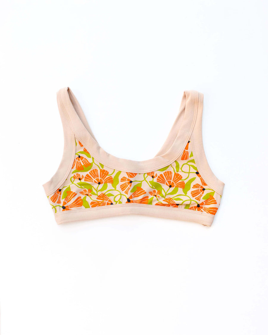 Designed by local illustrator Anna Trella Ruth Miller, this floral are printed on Pine Nut in a mid-century inspired soft orange and pea green with little black accents.