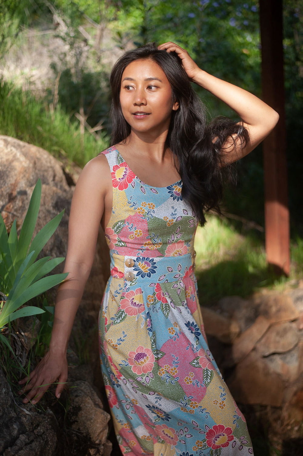 The Brigid Jumper in a Patchwork party print rayon challis. Lightweight and feathery, feels like wearing nothing at all.
