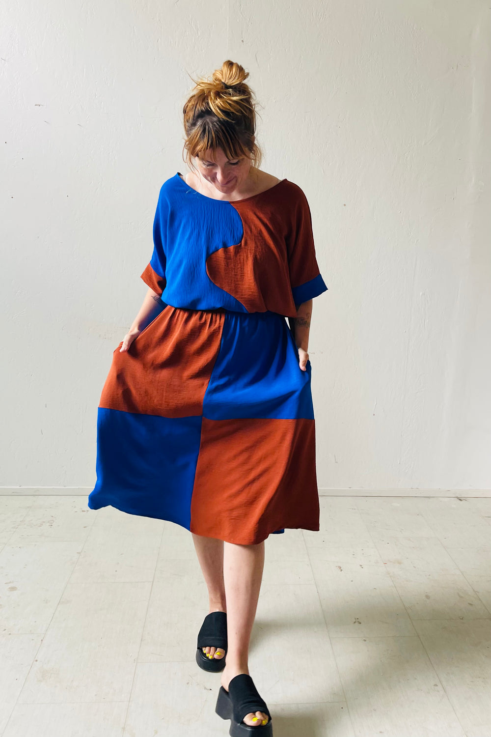 The Eva Midi Skirt in Kristina Grid offers exceptional versatility, making it a wardrobe essential that can be styled in countless ways. Crafted from a luxurious poly airflow deadstock fabric, it features a striking grid pattern with vibrant ultra blue and rich brick tones. This fabric is silky, soft, fluid, and fully opaque. We plan to continue producing this design using various deadstock fabrics, ensuring a fresh and exciting selection with each release.