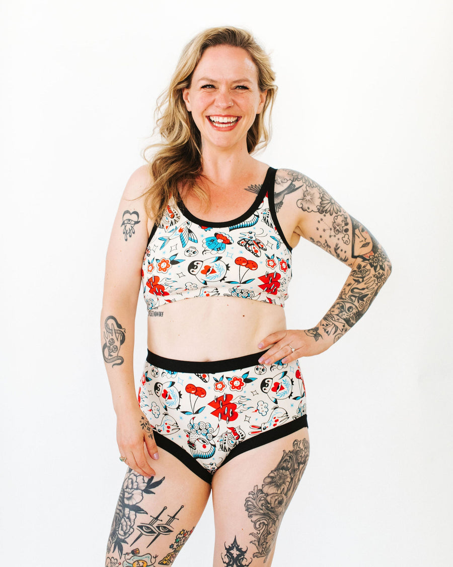 This ink-redible print is illustrated by local tattoo artist Connie Gabbert. Her work is a perfect mix of whimsy and traditional style, and every one of these adorable characters pops to life. We wanted to cover our whole bodies with her tattoos, so we thought, what’s better than covering thundies with them? Now you can be inked up whenever you want!