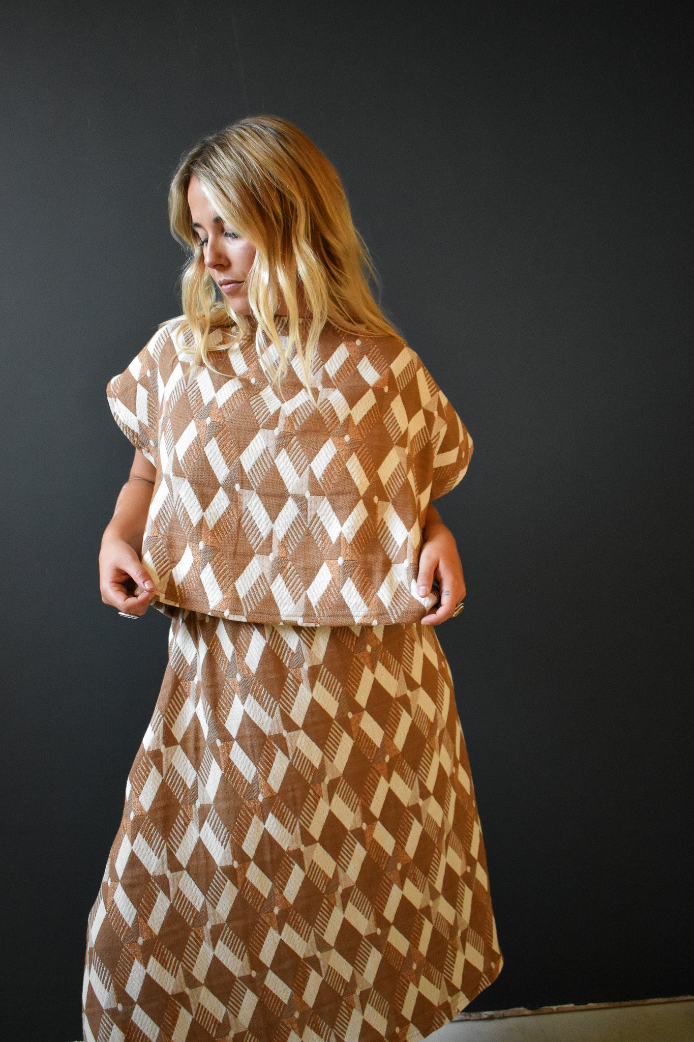 This quilted flounce crop top pairs seamlessly with the matching sweater knit skirt. Crafted from luxurious double-knit sweater fabric, it features a boxy, oversized silhouette for a contemporary look.