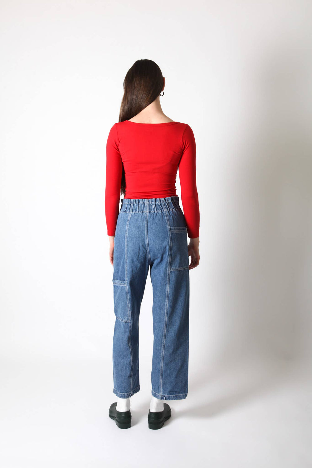 Carry all in your Rally pants! These pull-on trousers feature roomy asymmetrical pockets and unique and durable construction detailing. There is a button and loop at each hem to adjust the ankle width and the pant silhouette. Cut and sewn by skilled workers for fair wages in California. This is a 100% cotton denim, woven by the renowned Cone Denim mills. Its weight is 11.5 oz per yard square, which makes for sturdy and forgiving denim garments. The “June” wash denim is 3oz lighter than the styles washed in “Yuba” and “Shasta”.