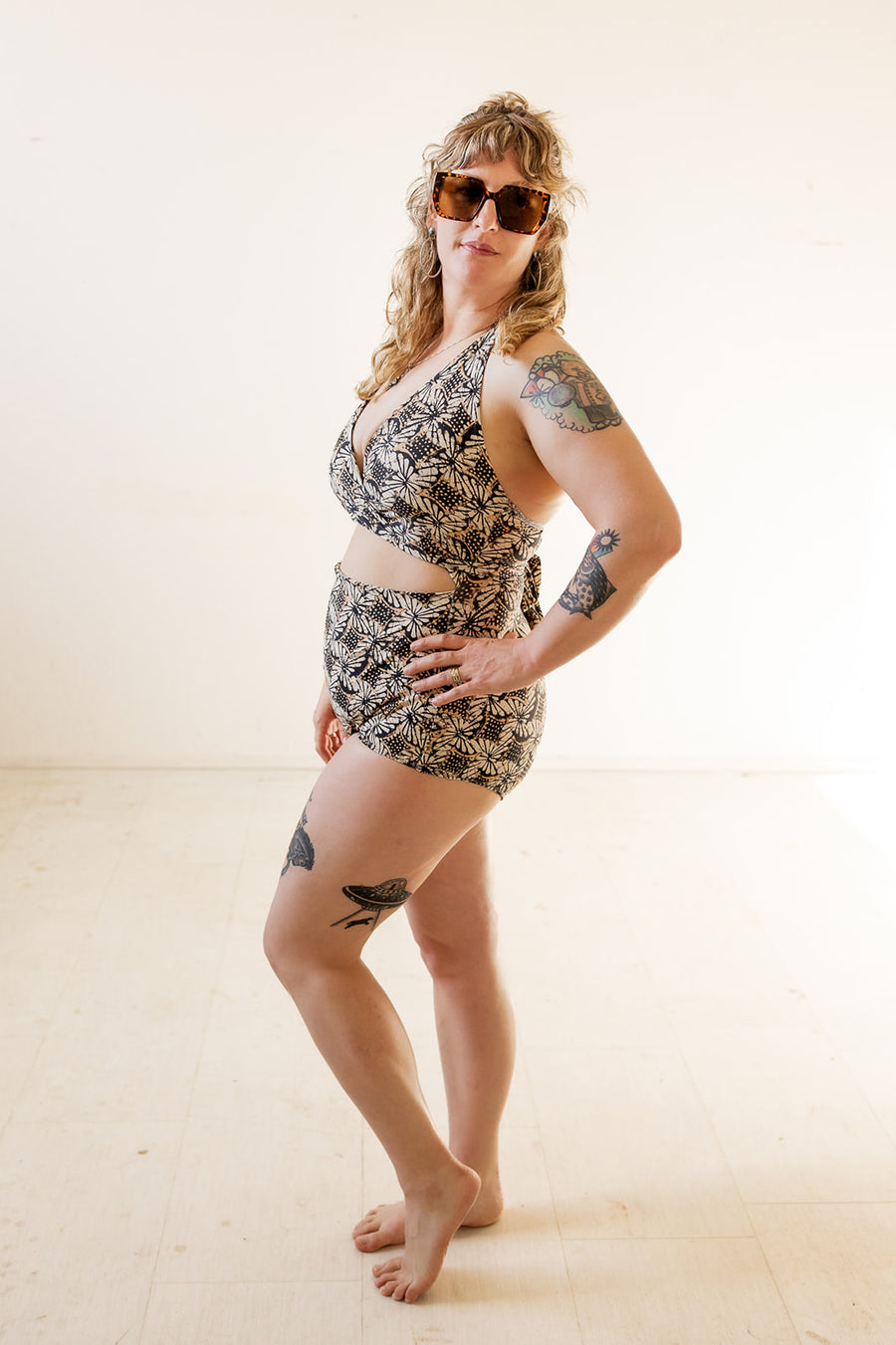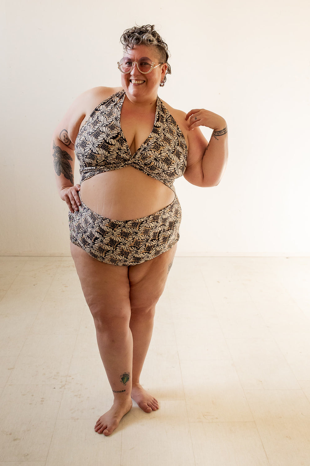 This piece is made of a four way stretch lycra swim material with a halter neck and high waisted bottoms. The tie front can be worn in multiple ways of your choosing. Hand wash and line dry.