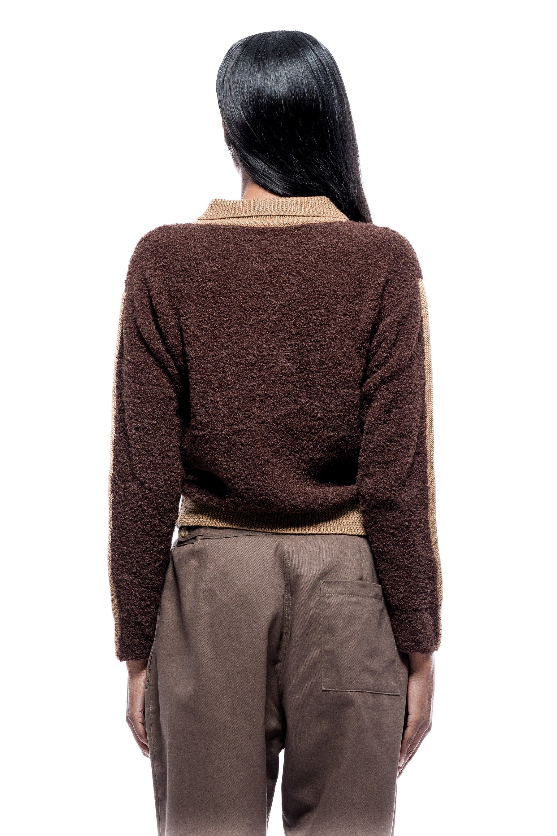 The softest superfine alpaca boucle yarn you can ever put on. Influenced by the racer sporty 70s, we designed a statement piece close fit pull-over Polo-like sweater. Easy to style with any of your favorite bottoms and keep you cozy and warm.
