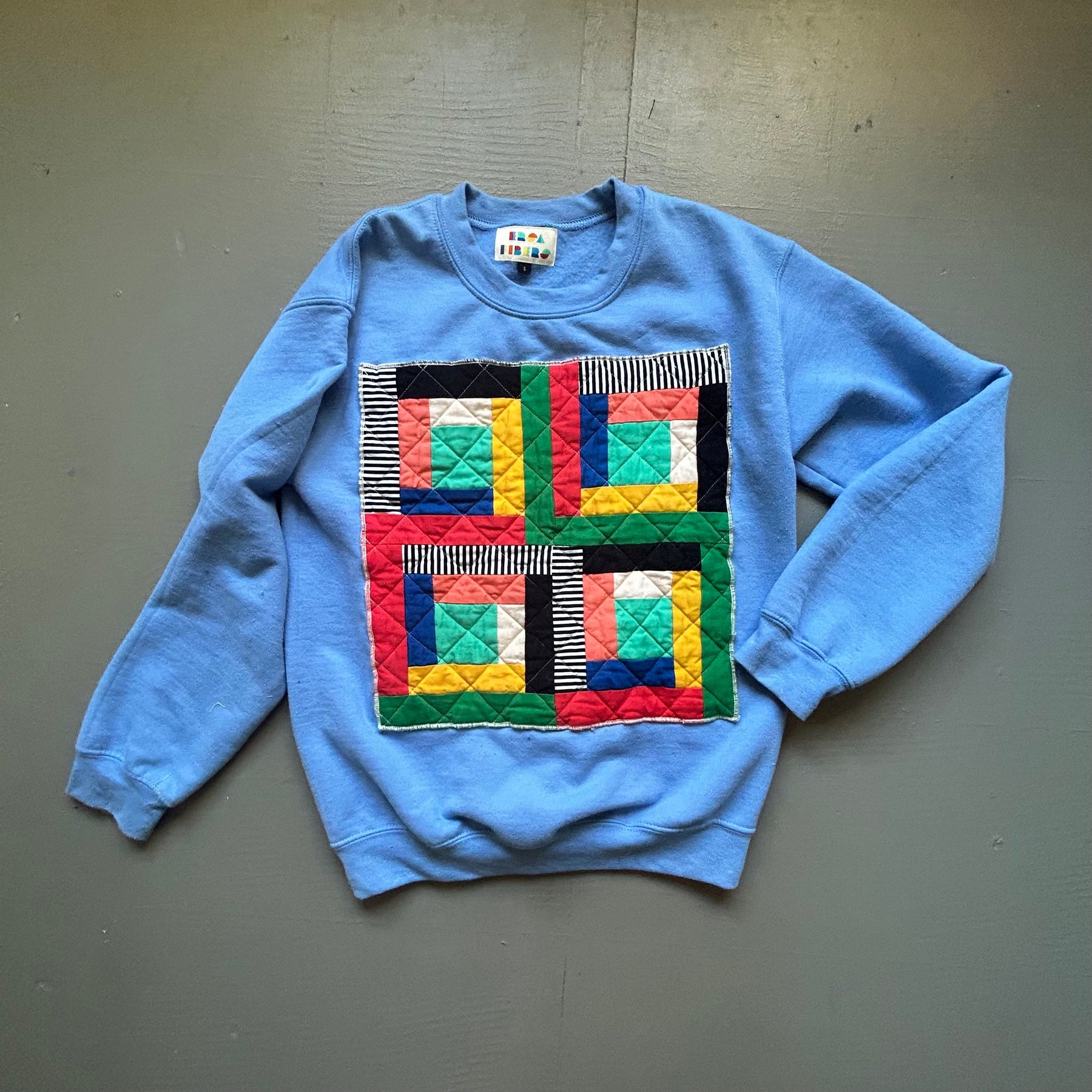 This crewneck sweatshirt features a classic log cabin quilt block, which has been meticulously quilted and hand-sewn onto it. Each quilt block is unique, with its arrangement of logs, making it a one-of-a-kind piece. The design is available in two color options: Carolina Blue or Royal Blue.