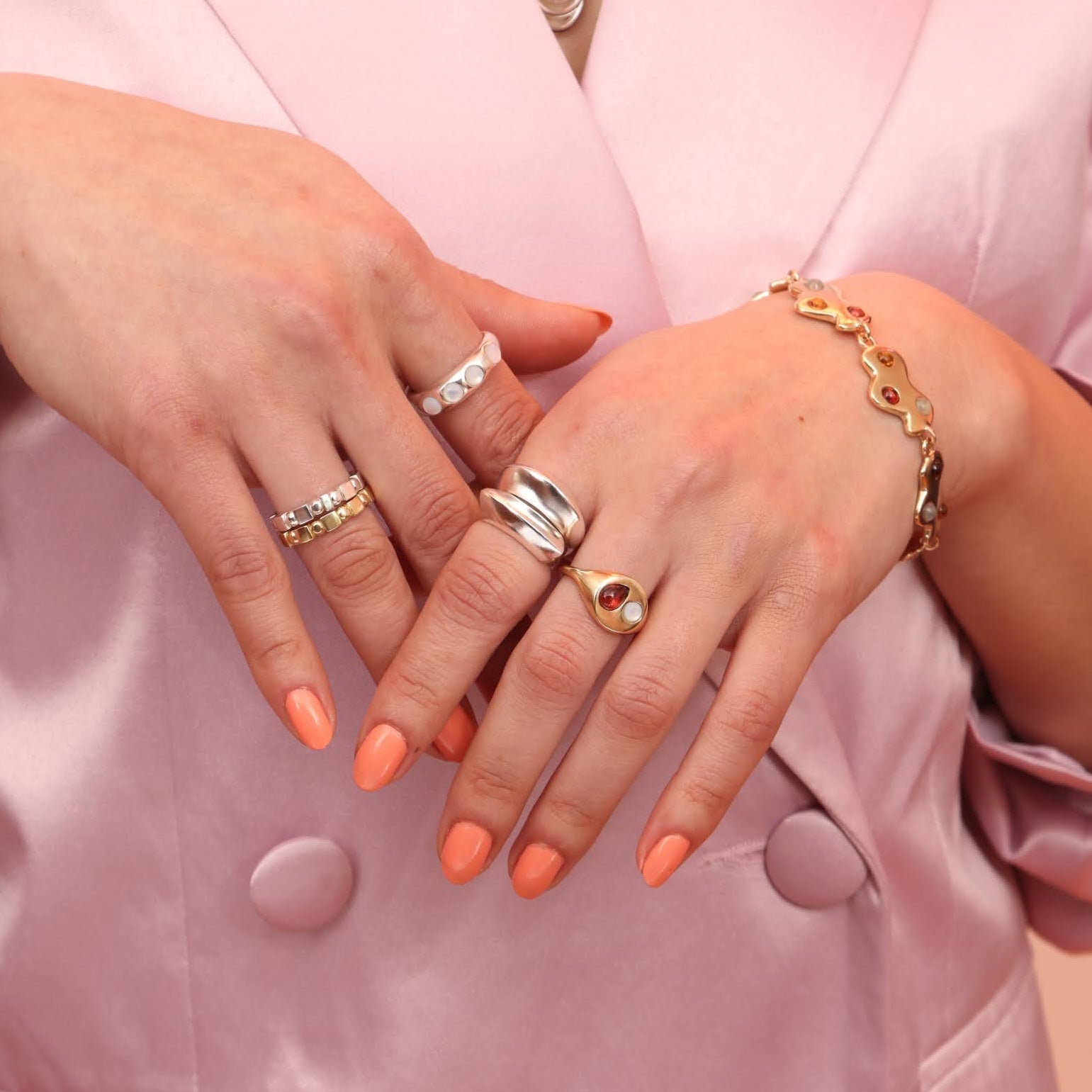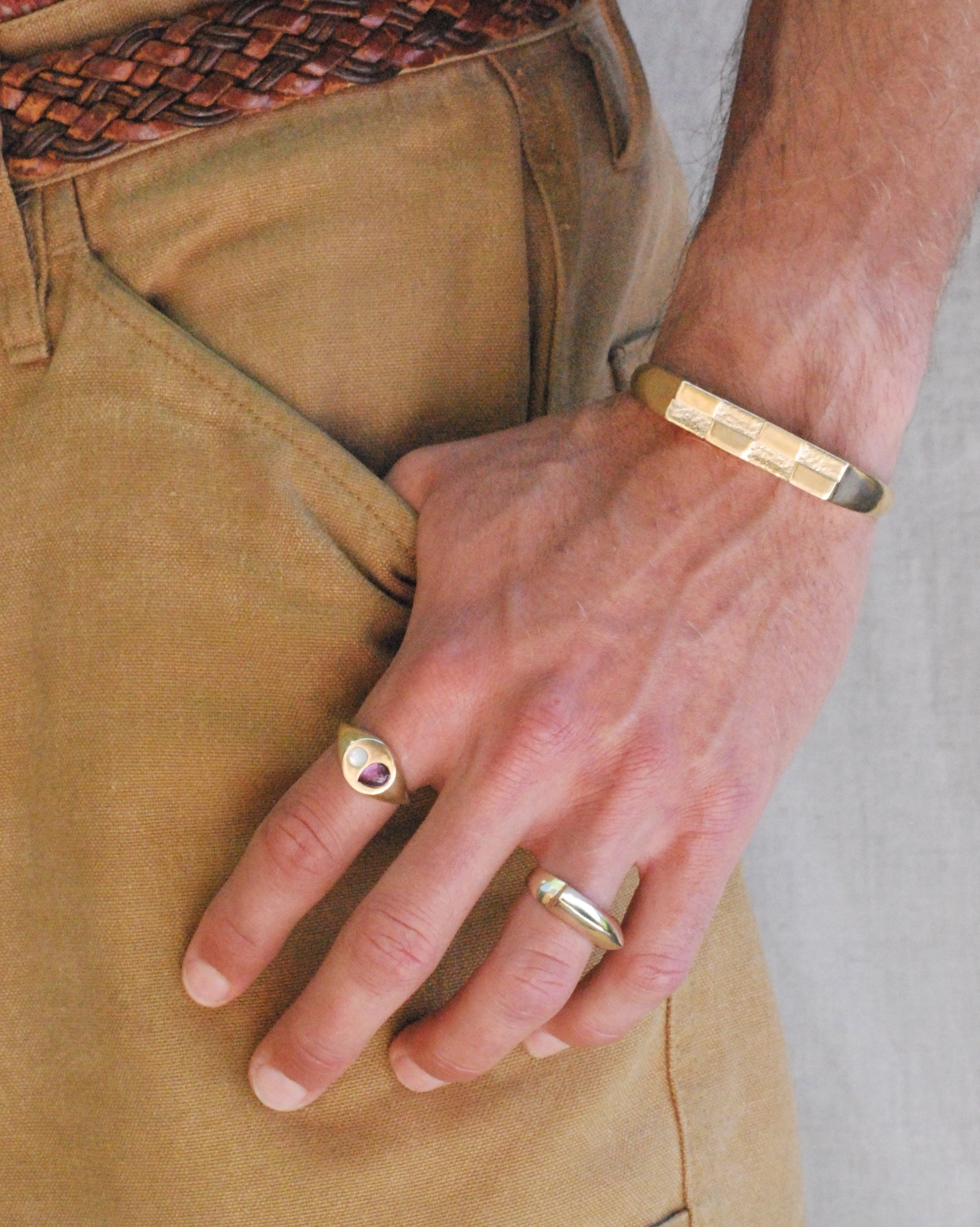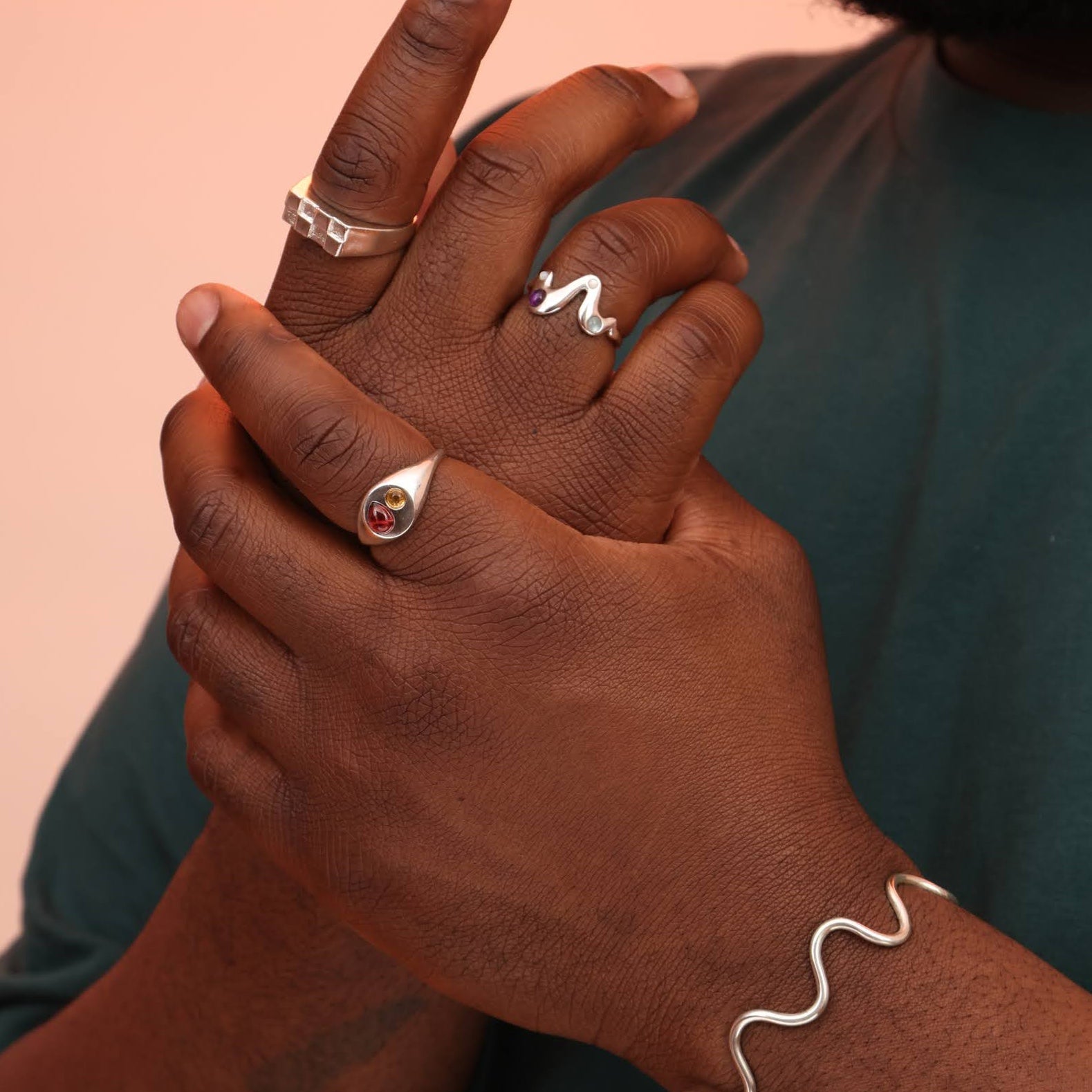 Handcrafted in Oakland from solid recycled metals — choose yellow bronze or sterling silver — it’s designed to stand out whether worn solo or stacked with other rings. Lightweight, comfortable, and sustainably made, this piece transforms everyday outfits into modern, artistic statements.