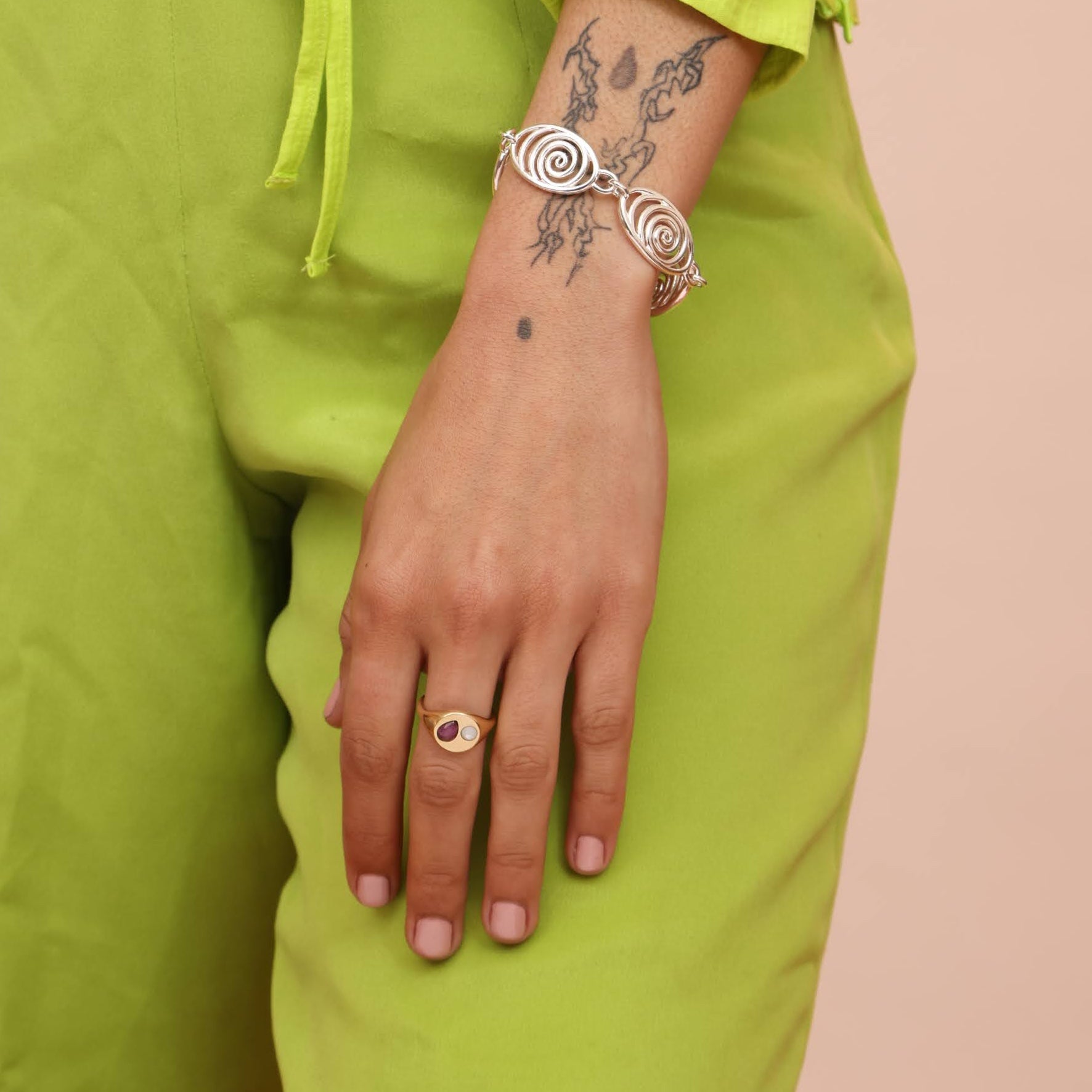 Make a bold yet refined statement with the Teardrop Signet Ring. Featuring a sculptural teardrop silhouette and a pair of vibrant cabochon stones, this ring blends minimalist elegance with playful color.