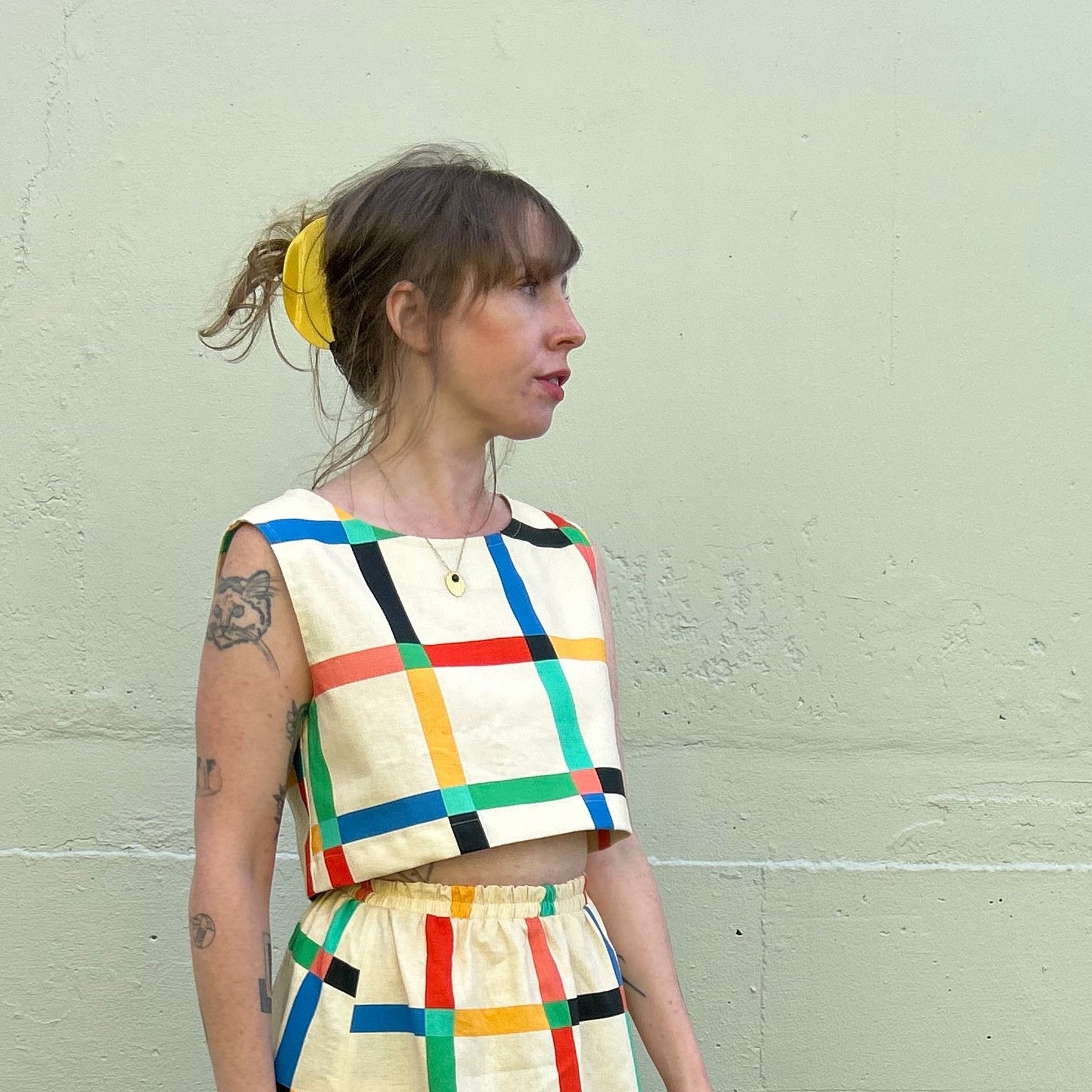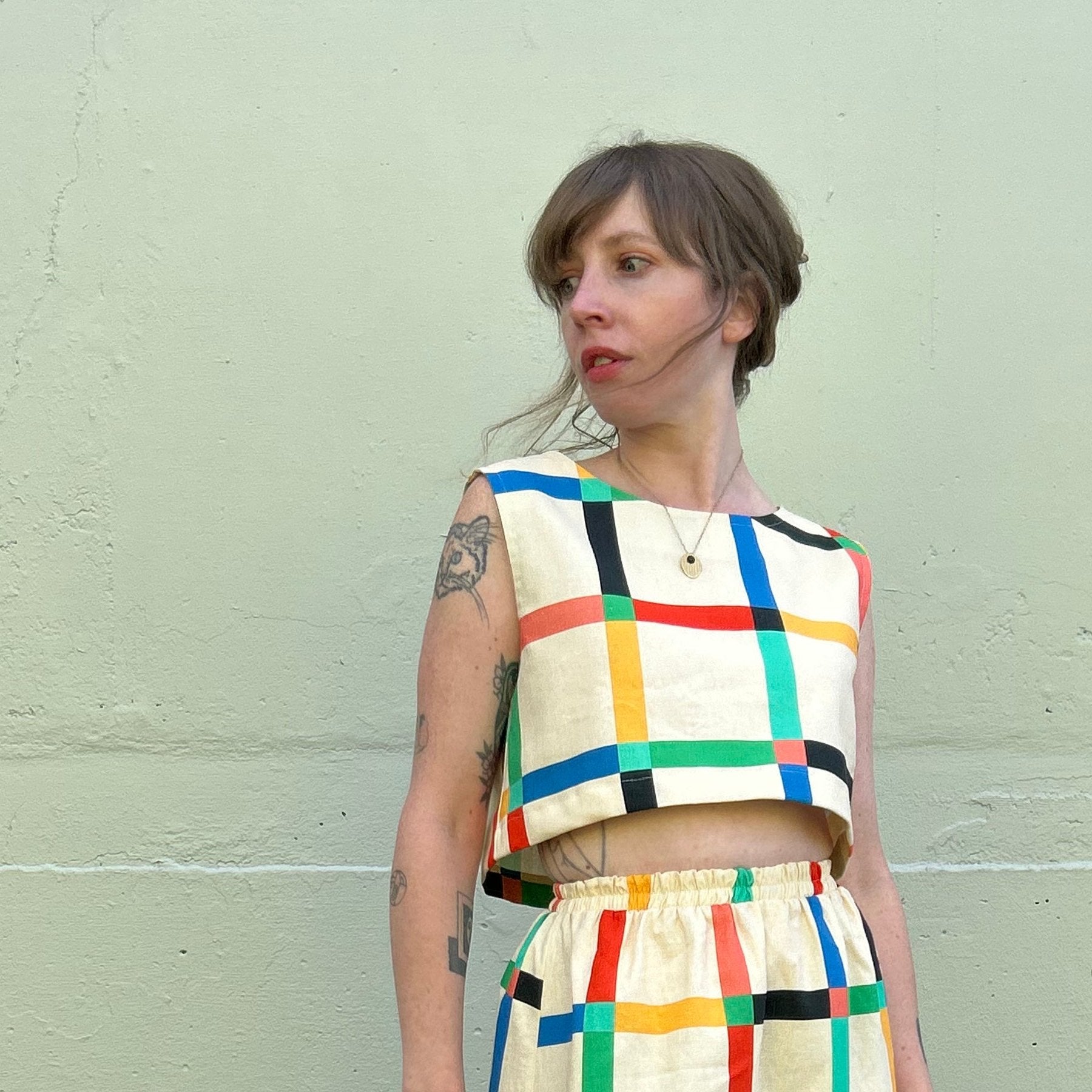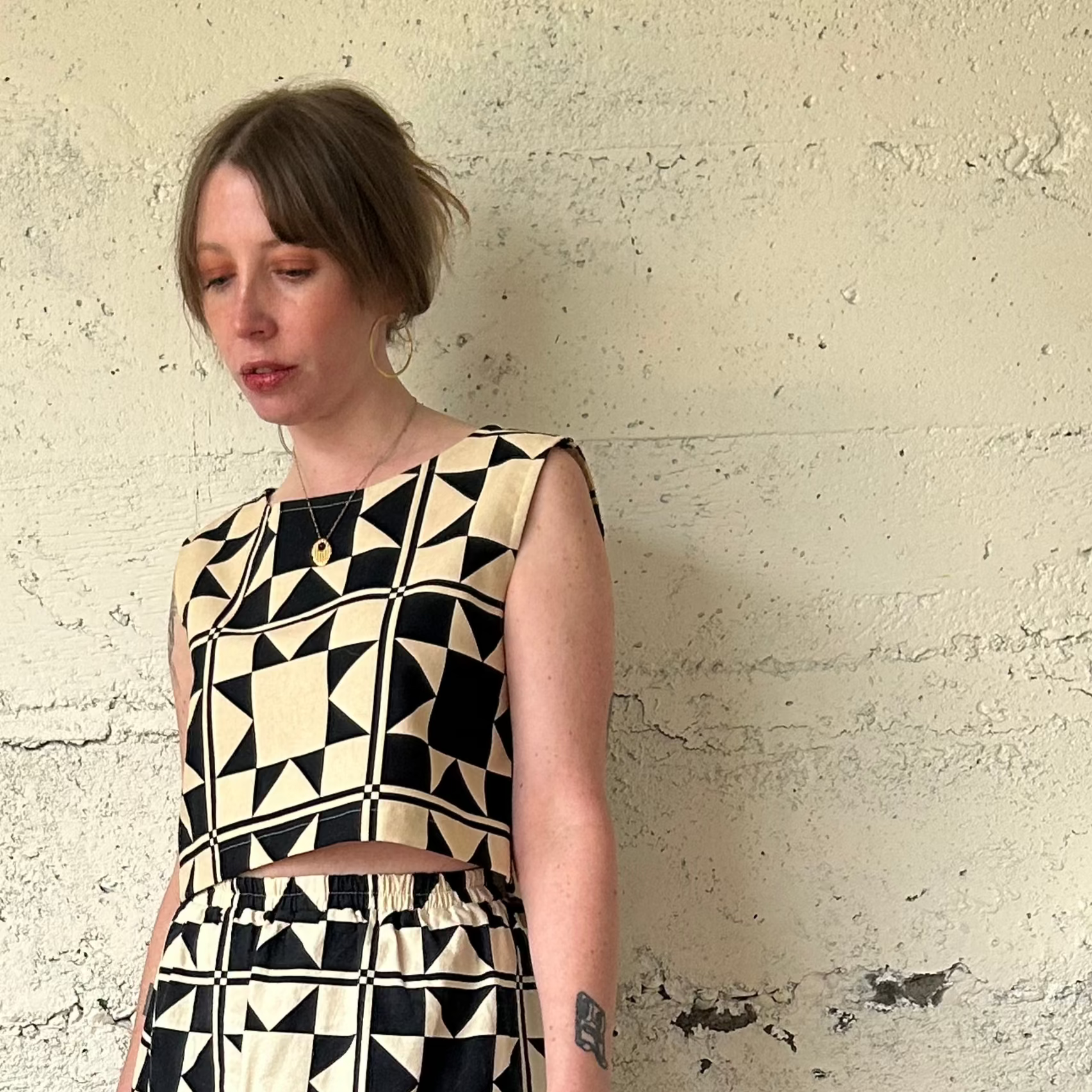 Crop top featuring a crew neckline, sleeveless, loose fit, and shorter length (default as pictured is 2.5 inches shorter than our Frankie top). If you would like a custom length, please add your measurement to your order notes.