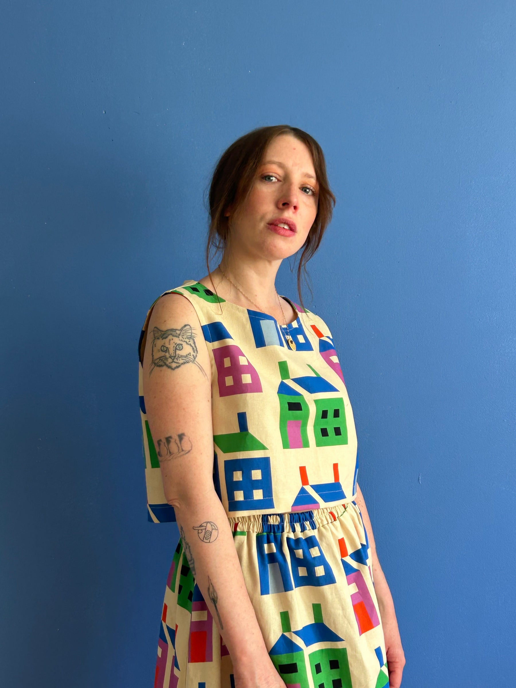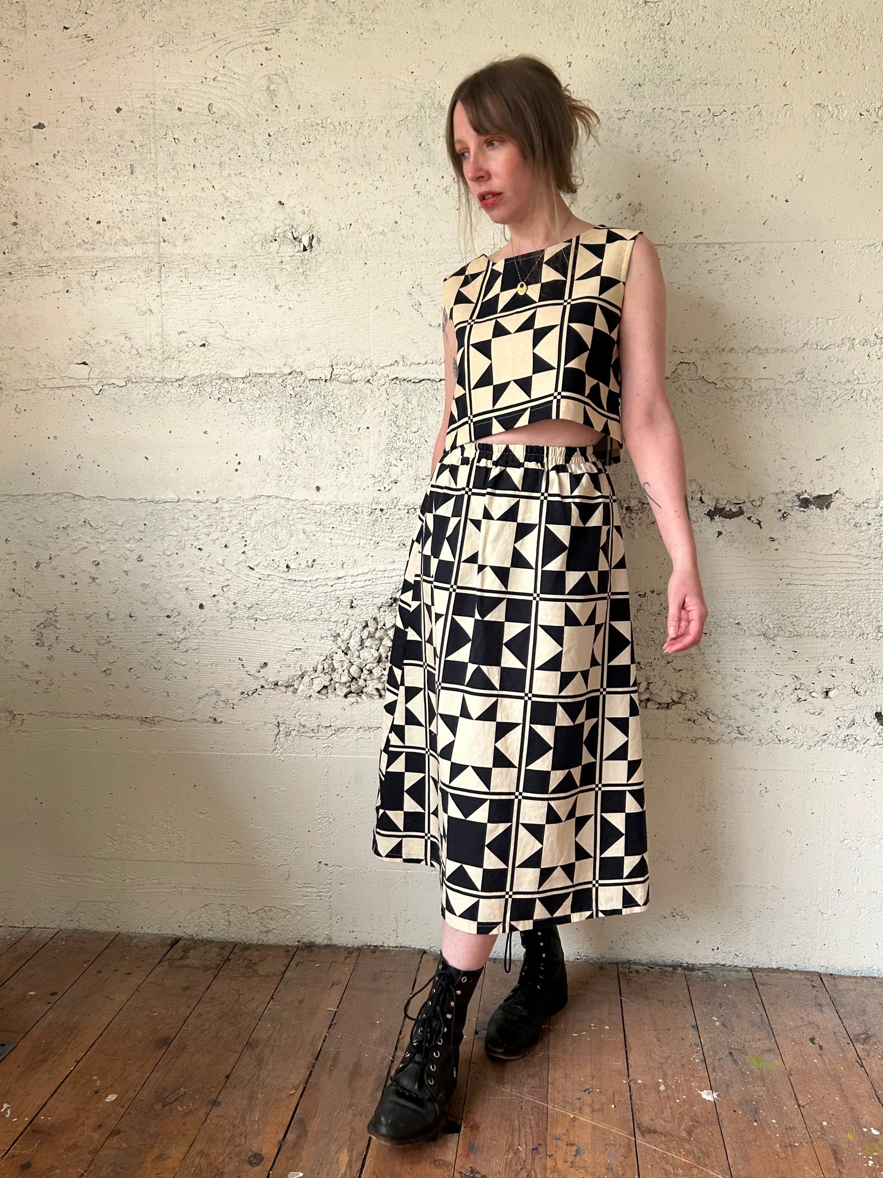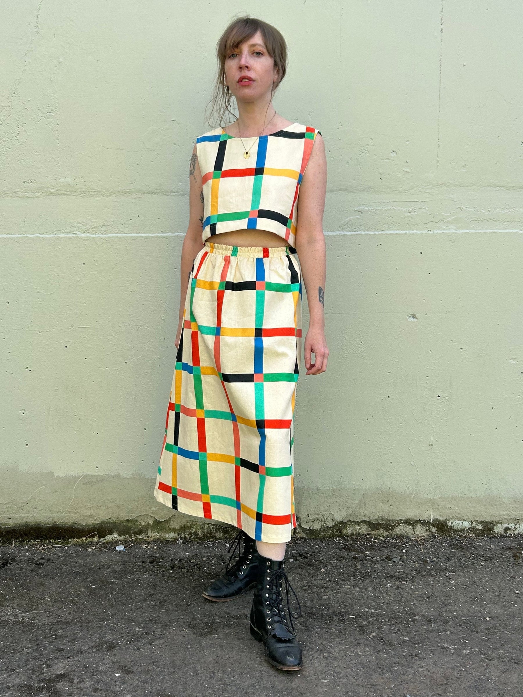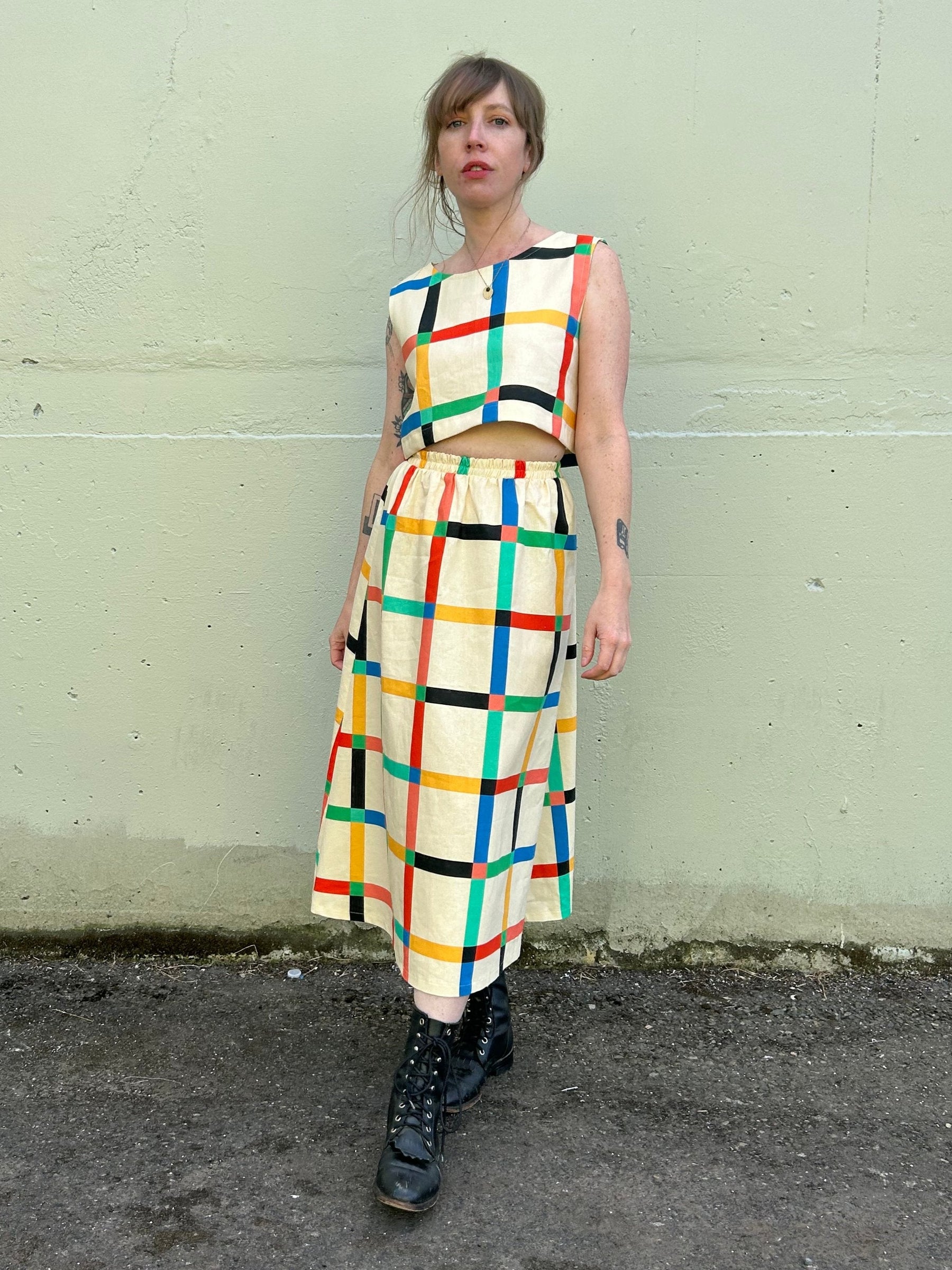 Crop top featuring a crew neckline, sleeveless, loose fit, and shorter length (default as pictured is 2.5 inches shorter than our Frankie top). If you would like a custom length, please add your measurement to your order notes.