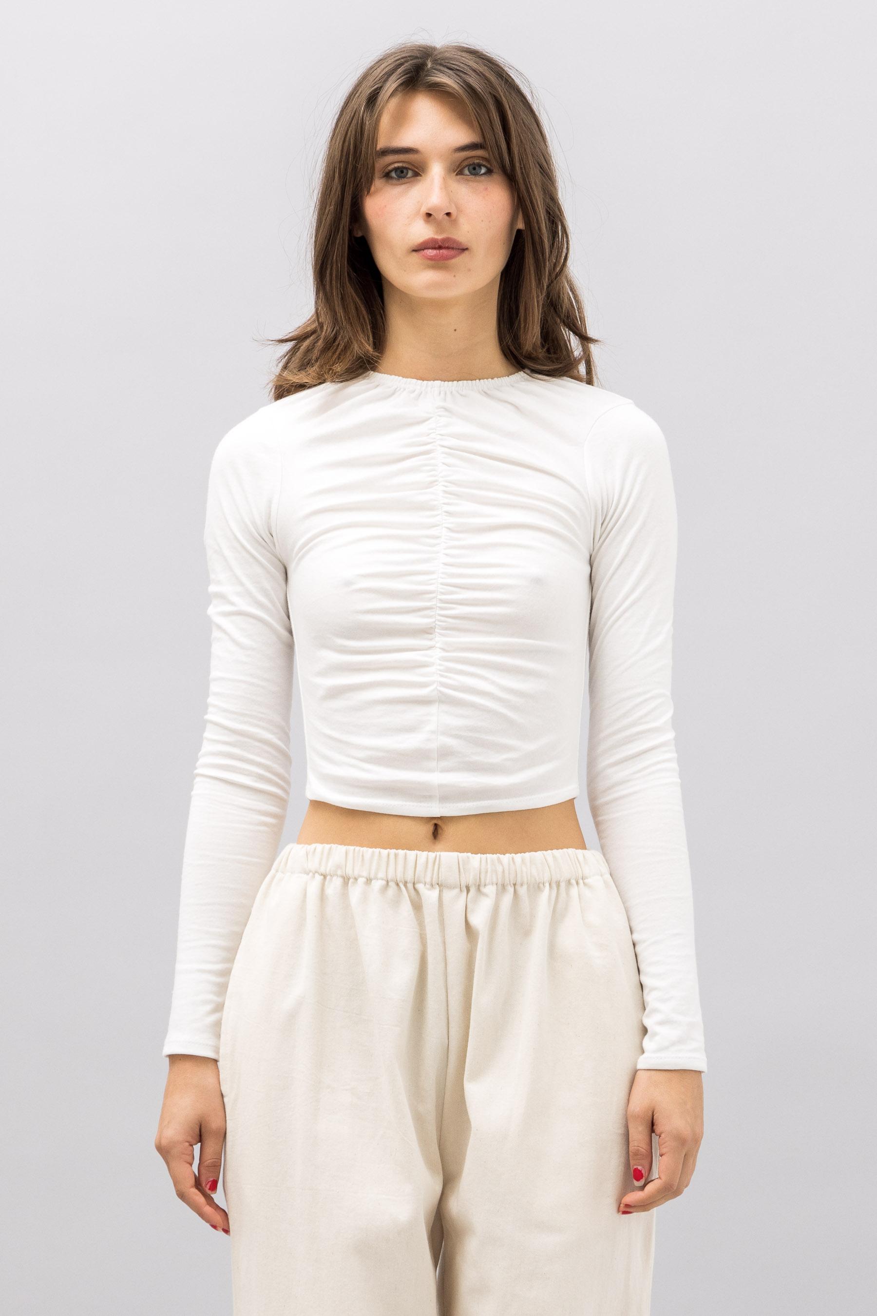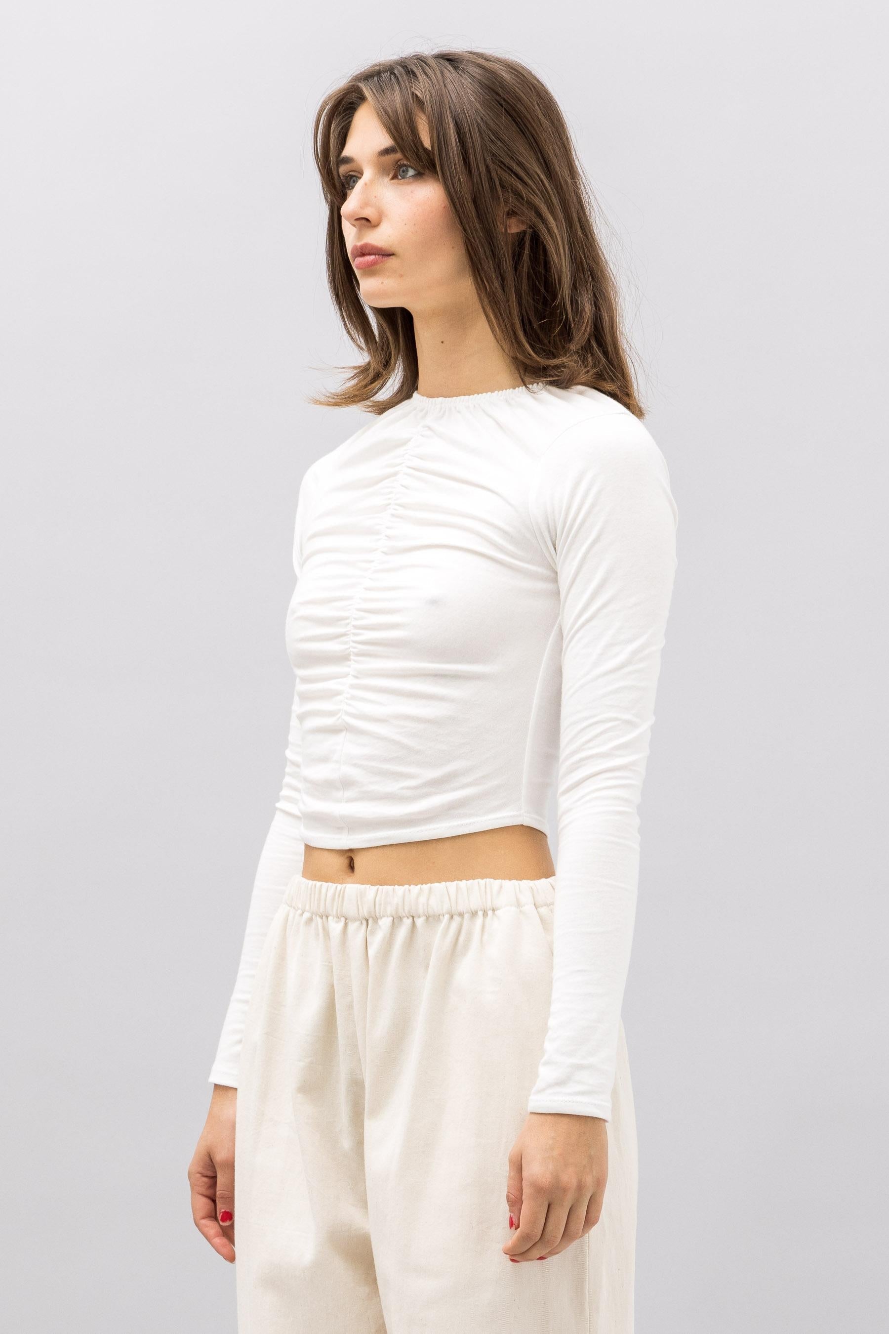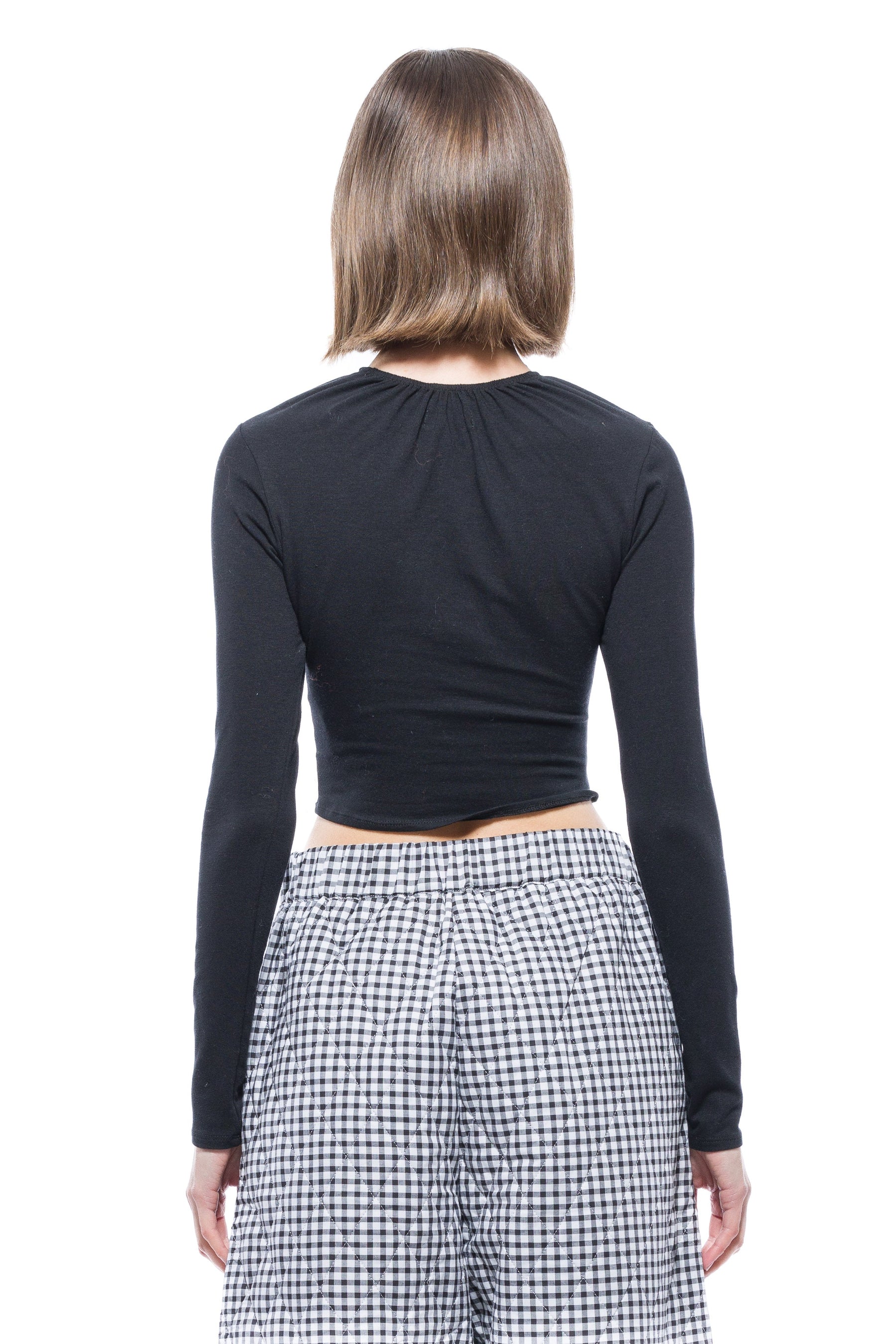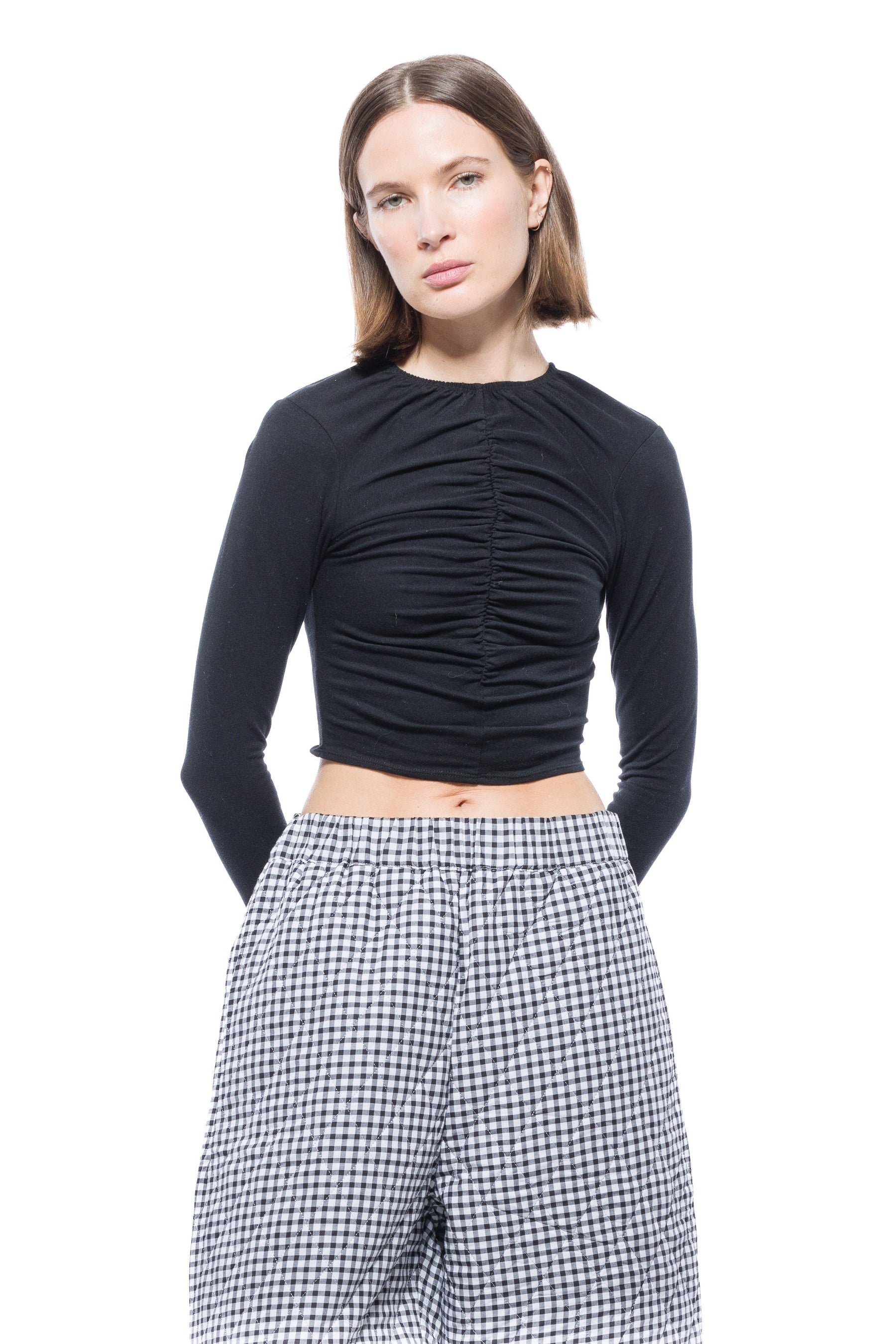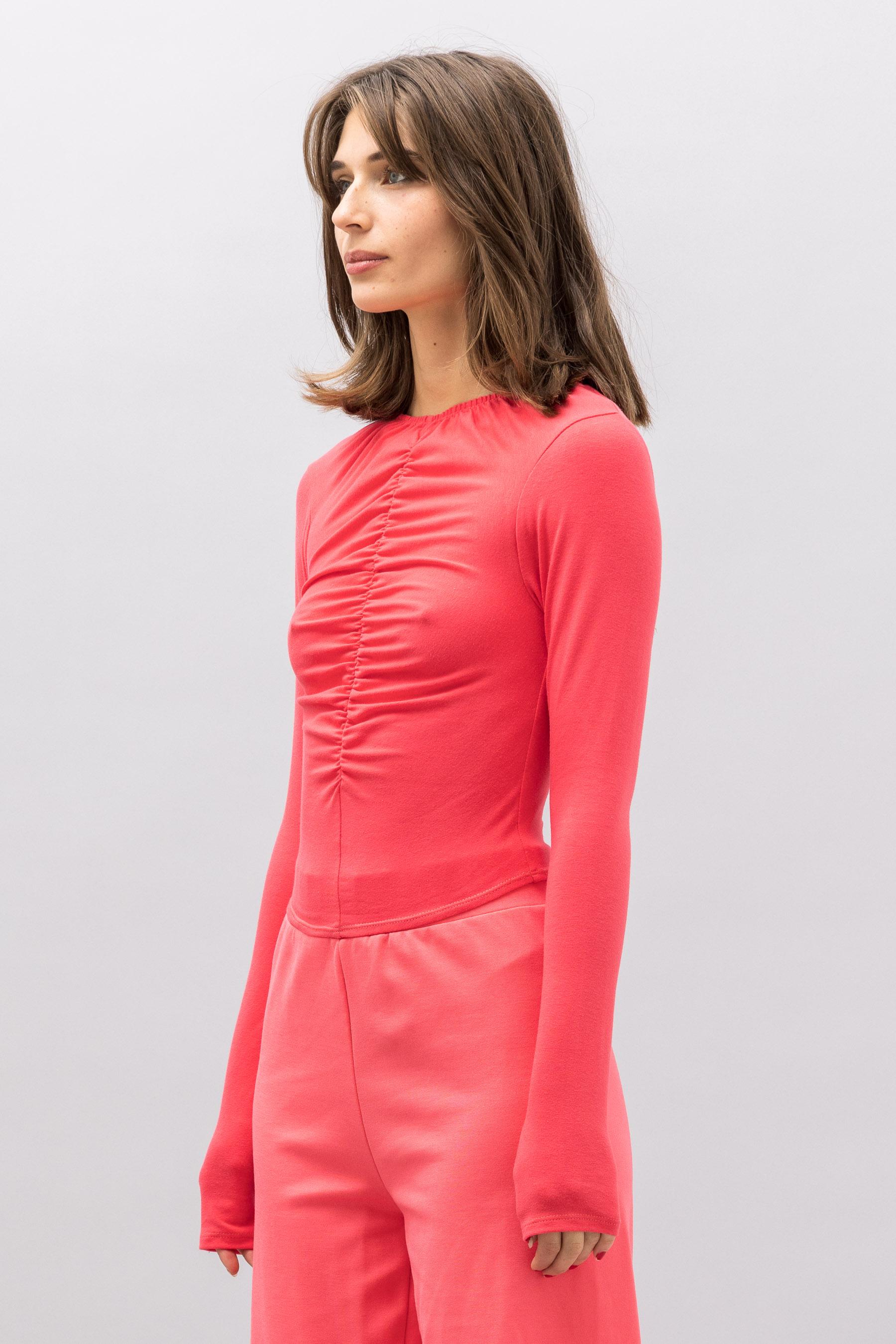 One of our best sellers, Totty Top. Long sleeves with a cinch-in elasticated round neckline and shirred elasticated center front.