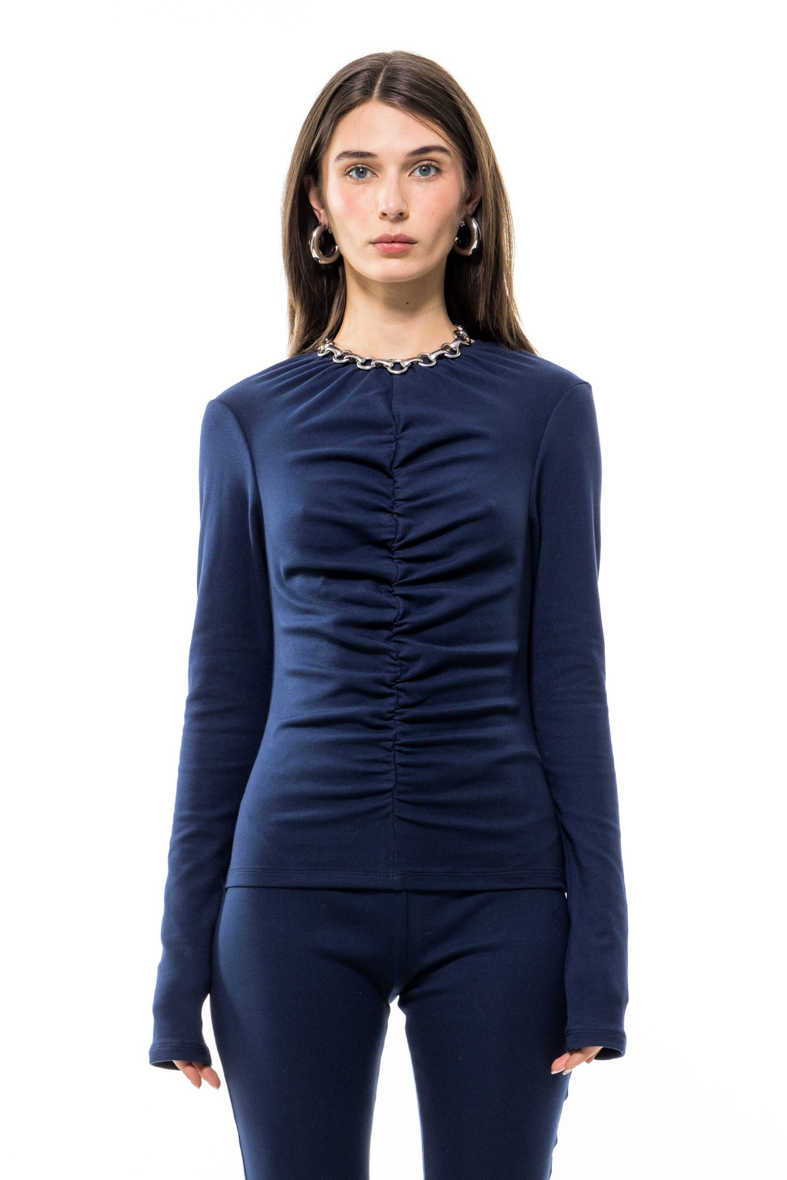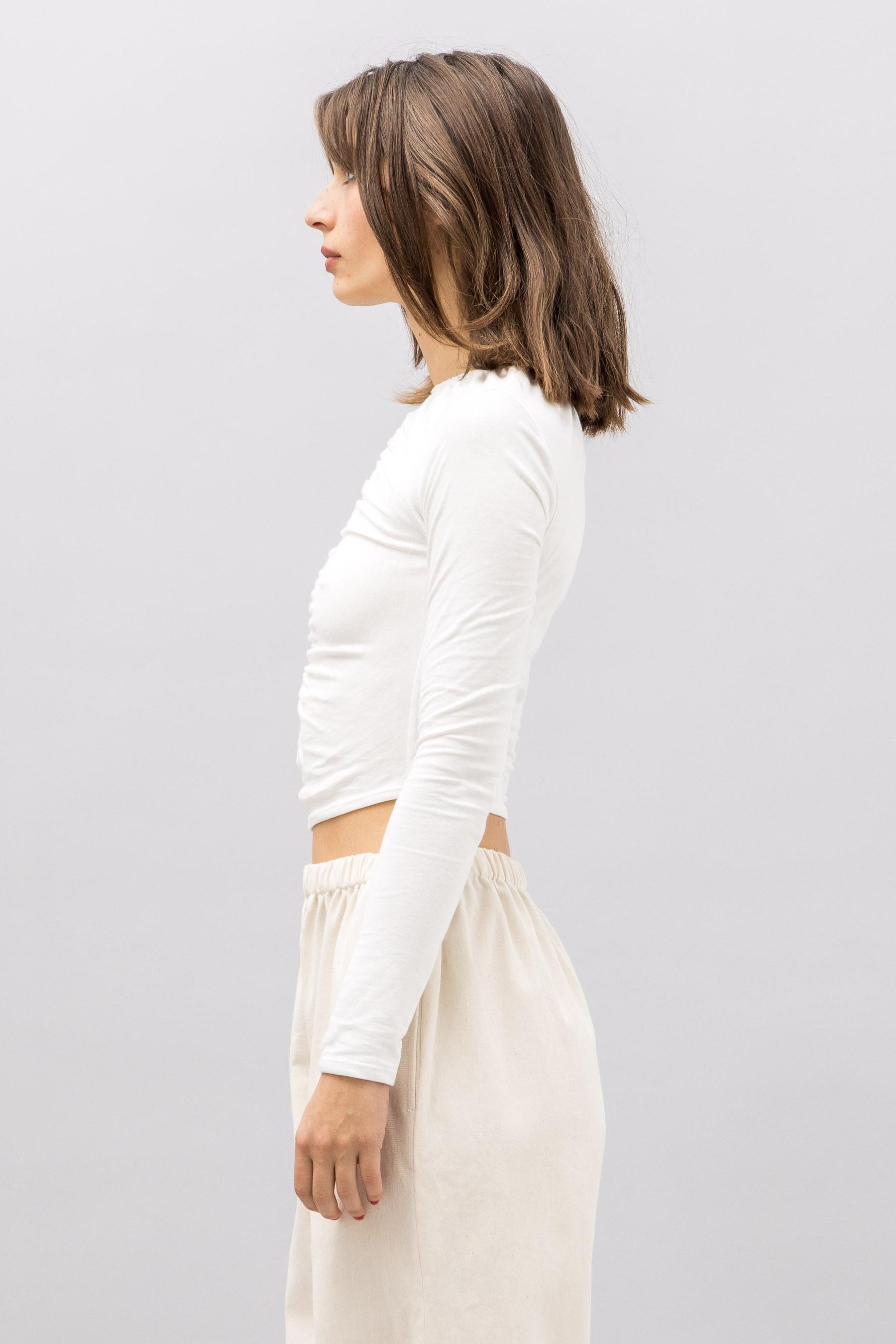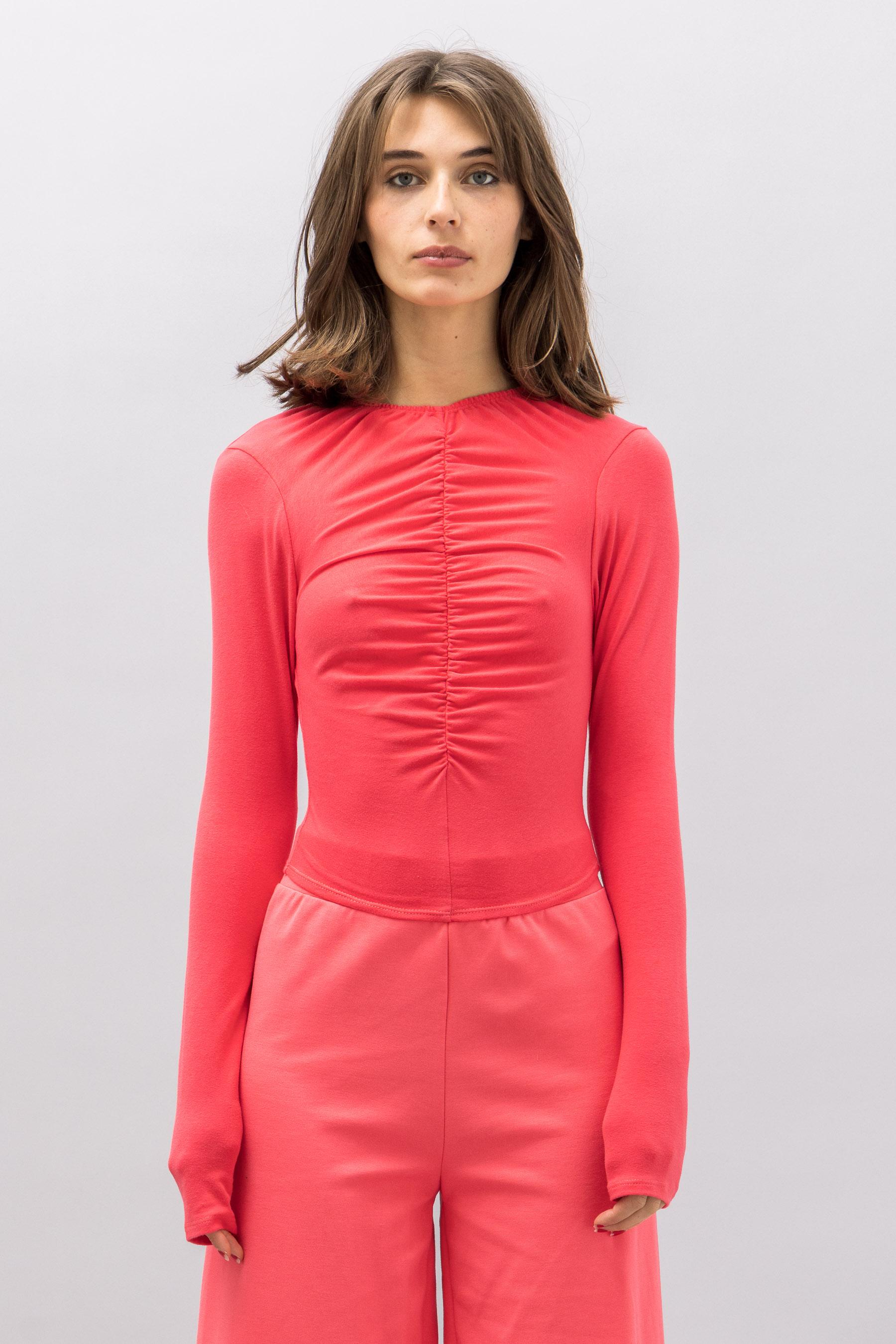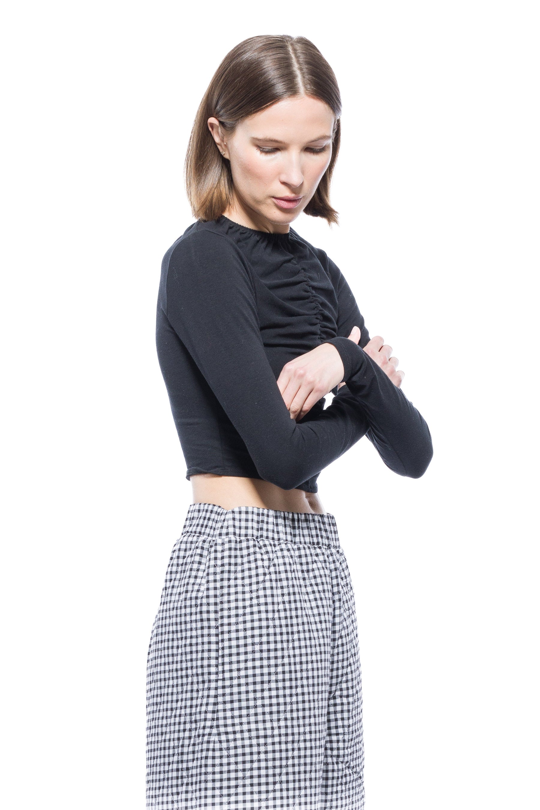 One of our best sellers, Totty Top. Long sleeves with a cinch-in elasticated round neckline and shirred elasticated center front.