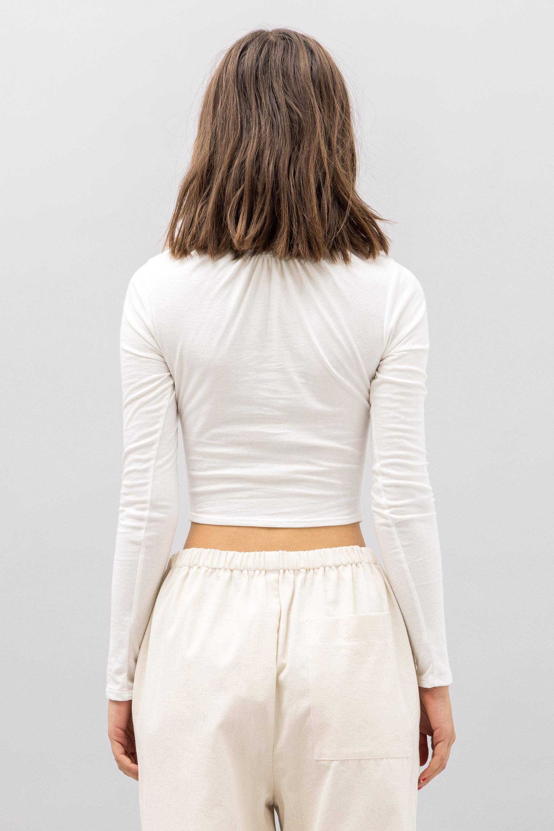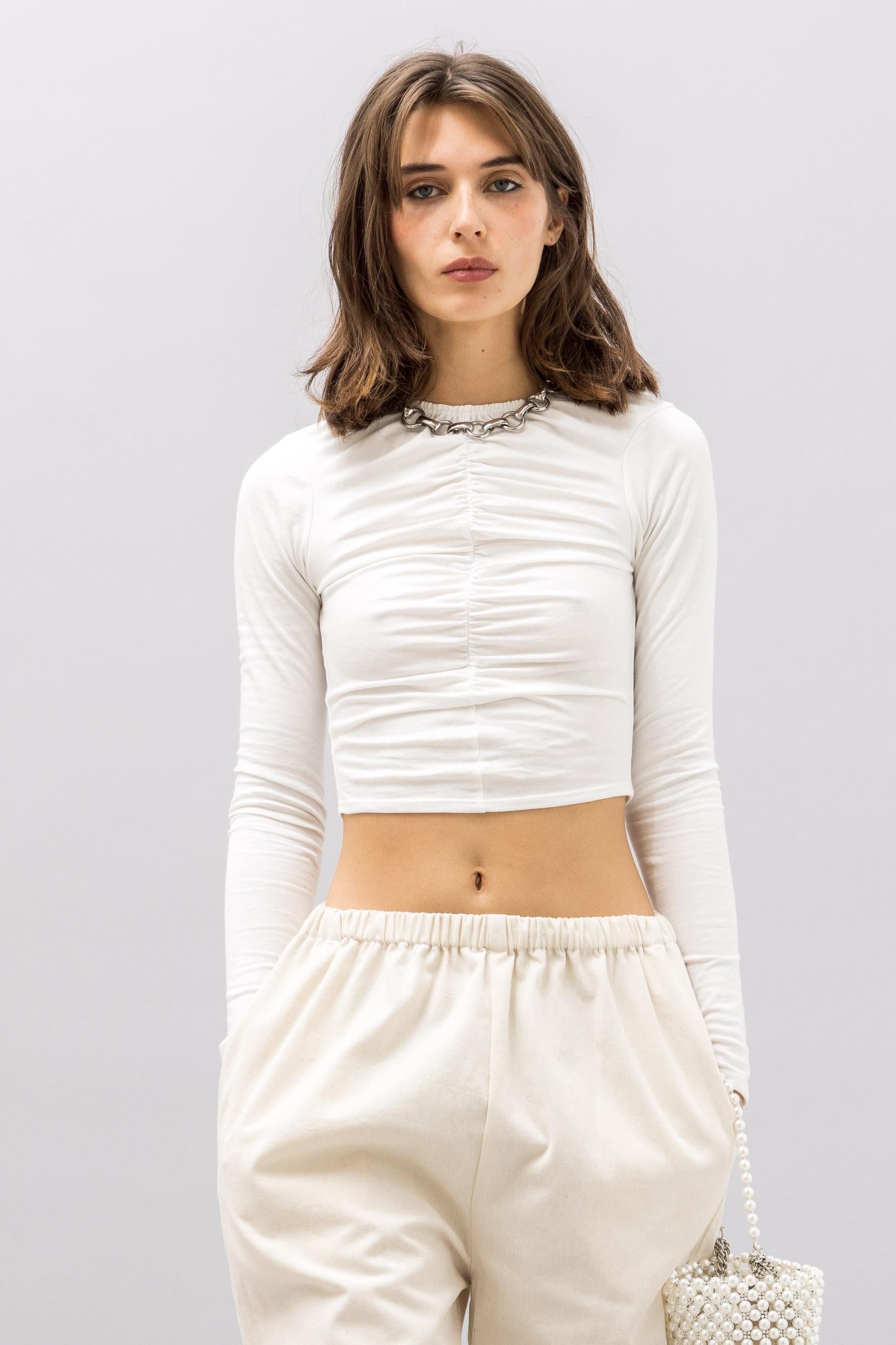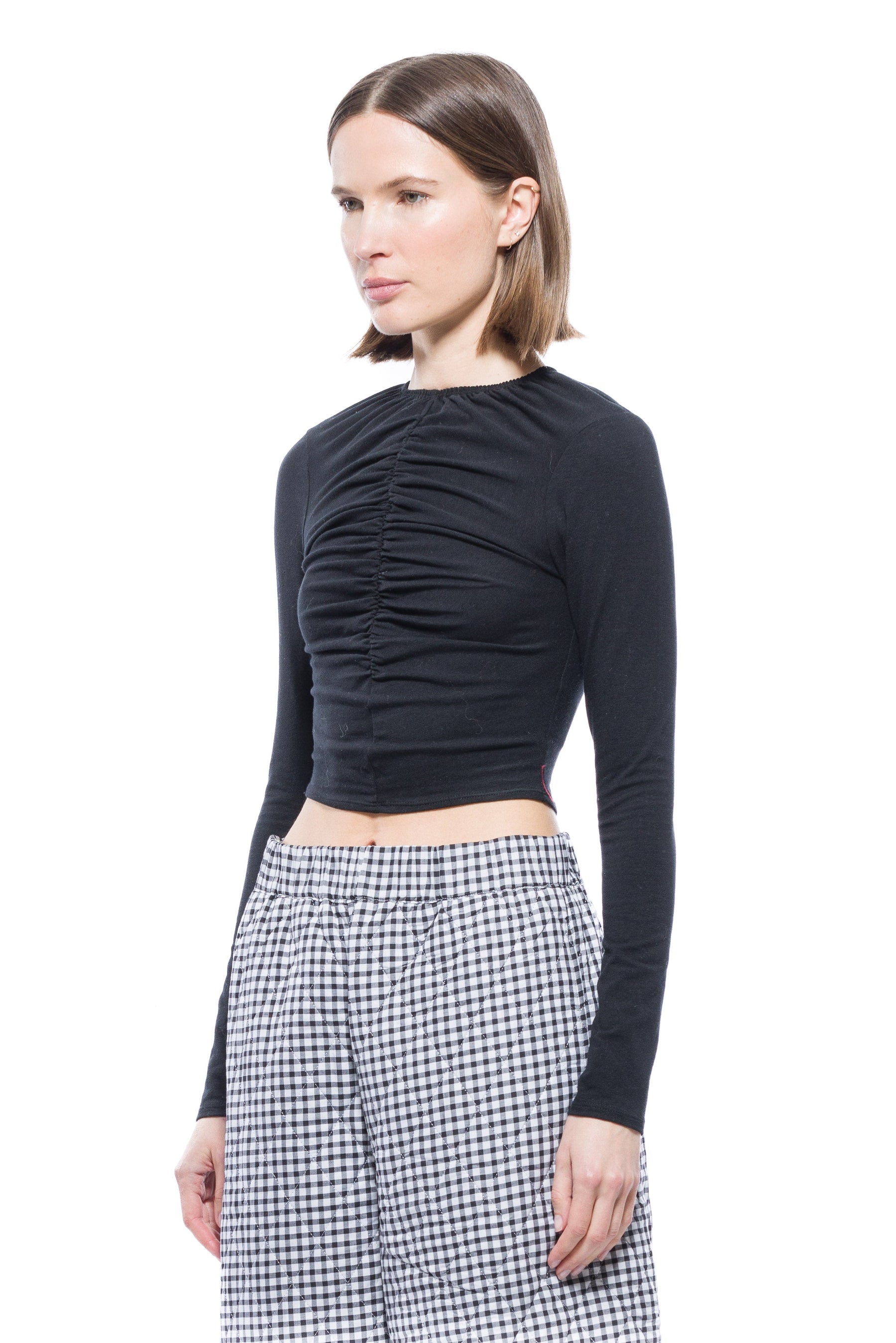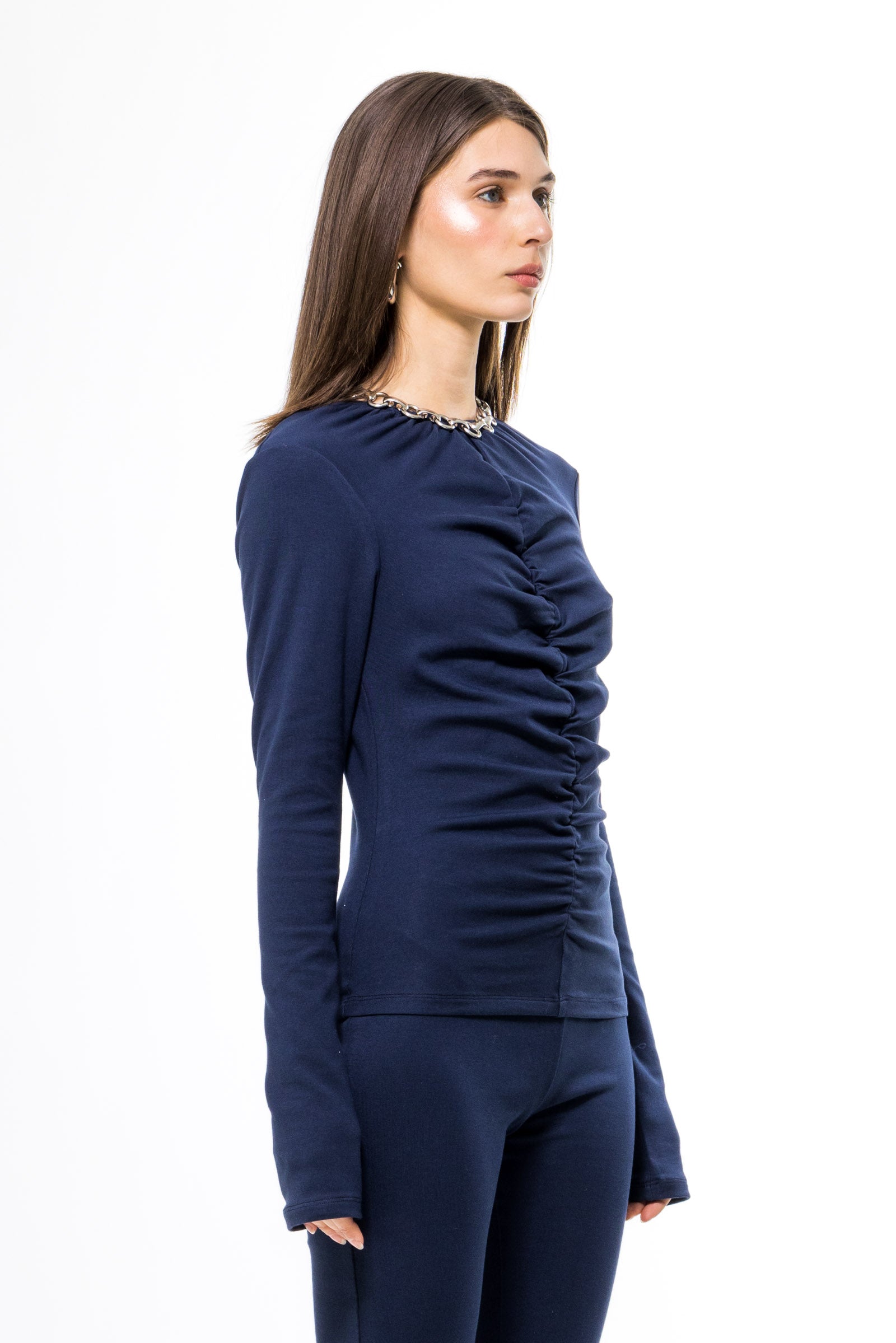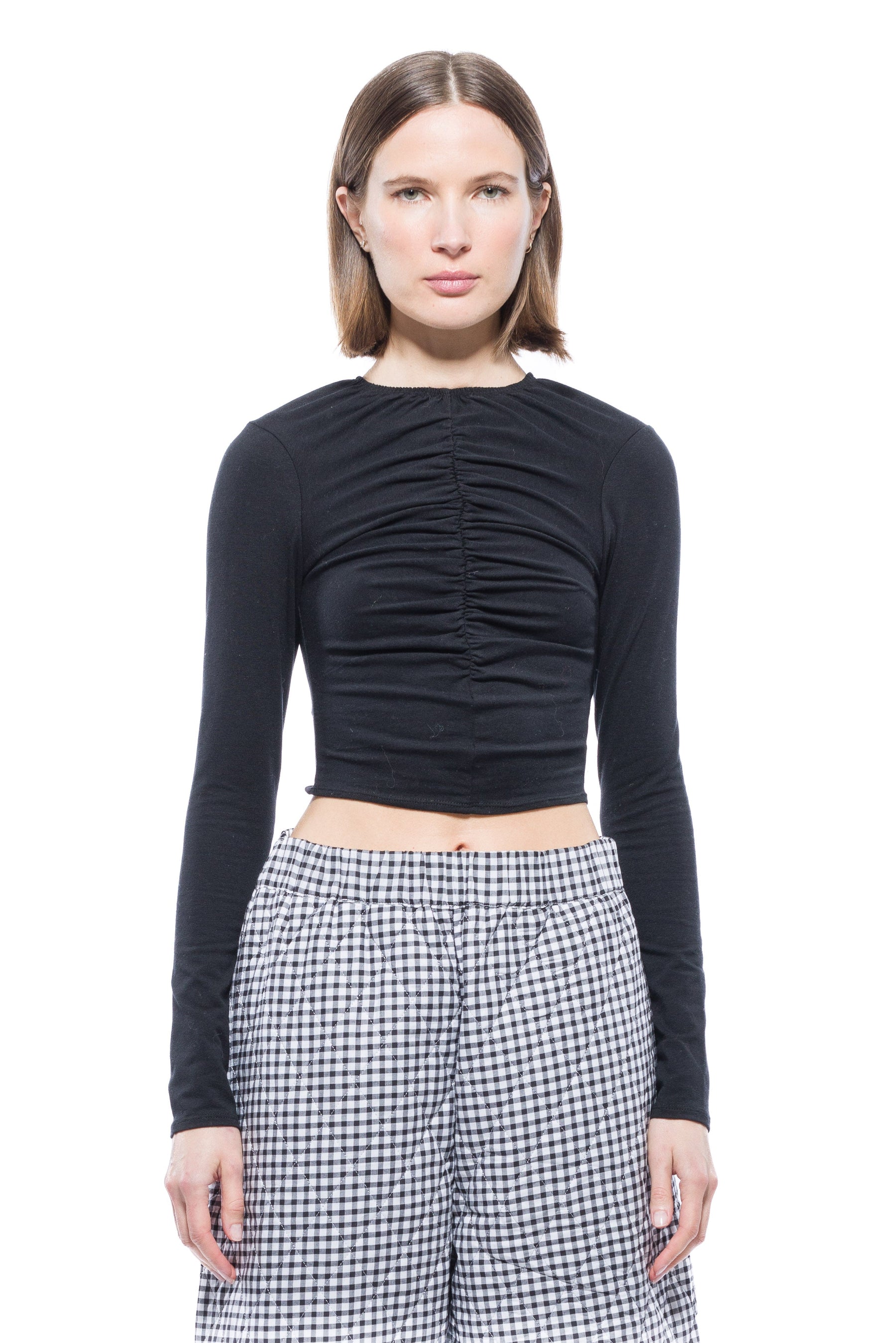 One of our best sellers, Totty Top. Long sleeves with a cinch-in elasticated round neckline and shirred elasticated center front.