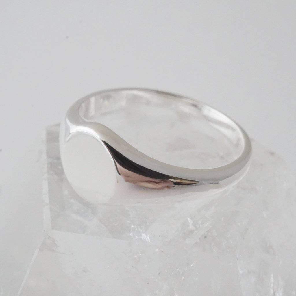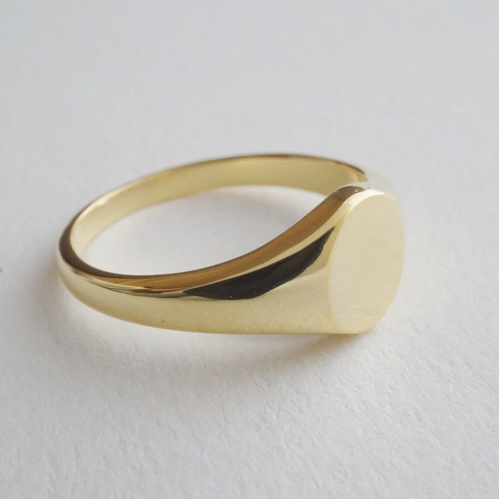 A miniature, sweet signet ring in a slim band with a flat, blank top.