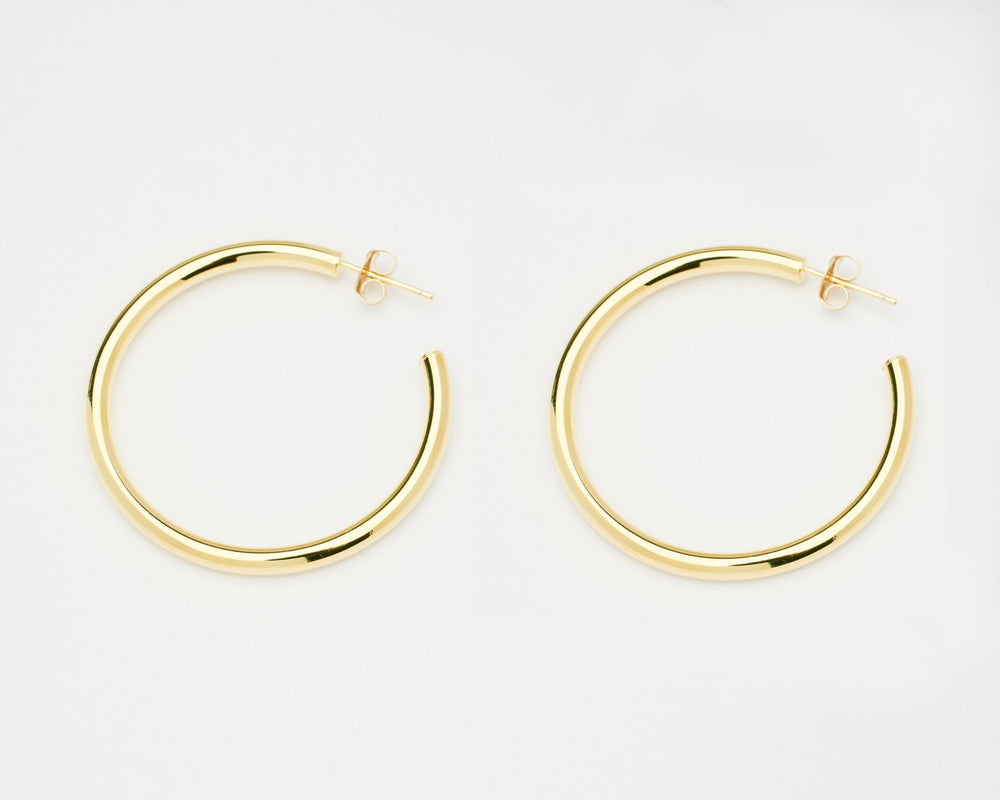 The Amor gold hoop post earrings remind us that some classics never go out of style. These 14k gold vermeil earrings are hypoallergenic and feature easy wearing post backs. At 40mm (approximately 1.5 inches in diameter), they're the perfect size for a bold statement.