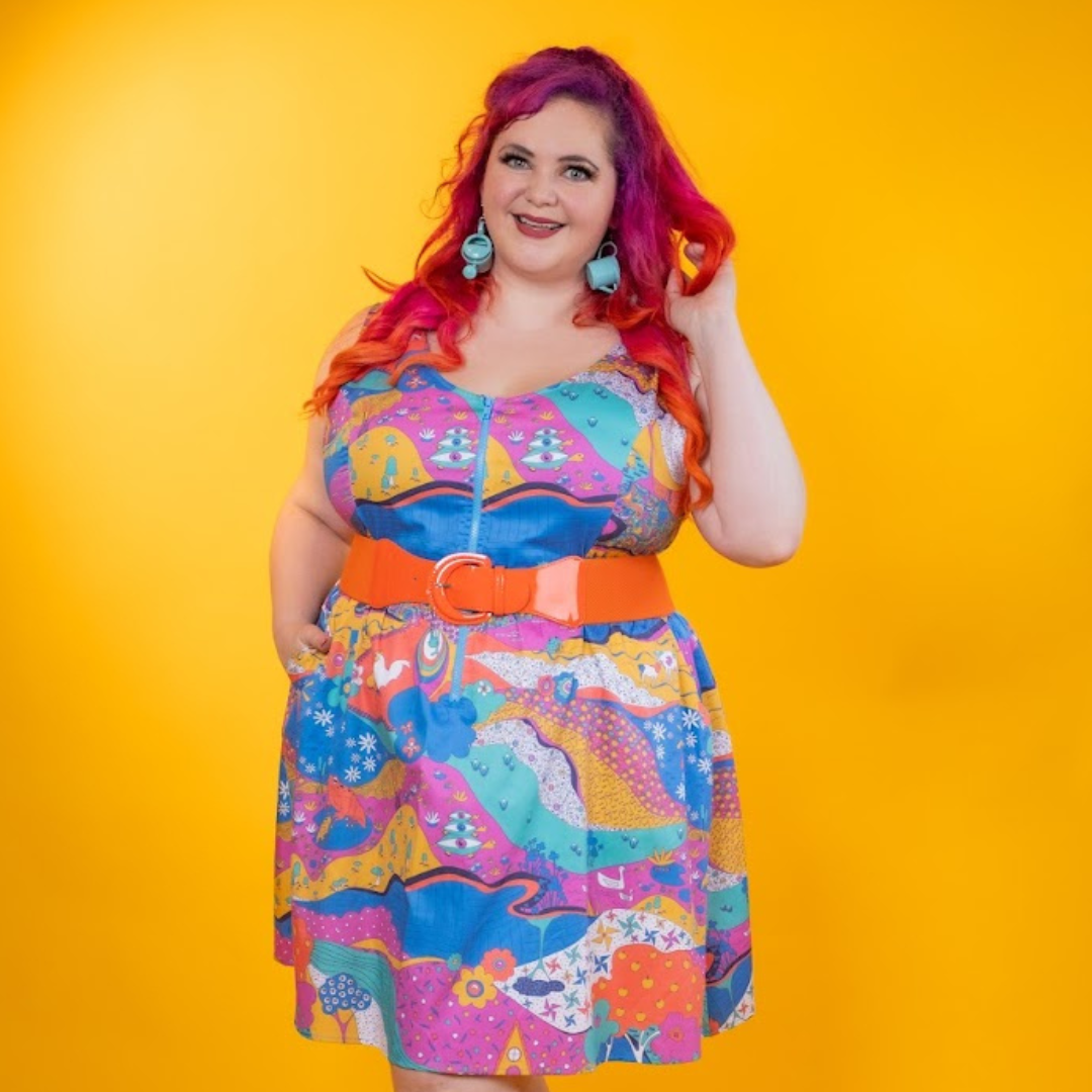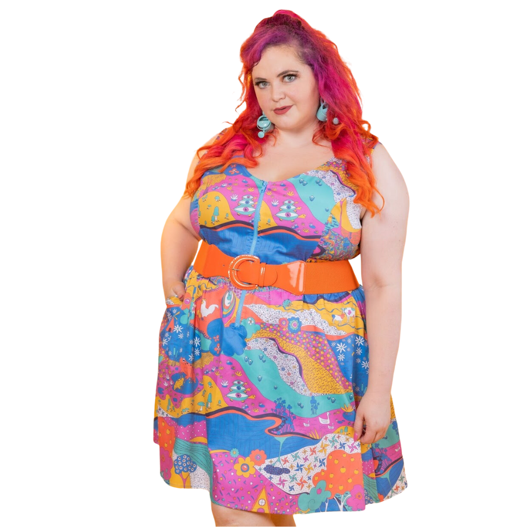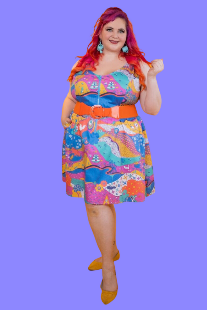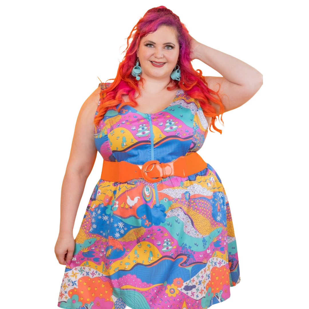 Here's an adorable woven dress, made of stretch cotton poplin!  Featuring our original, quirky '70s-inspired landscape print of chickens, turtles, apple trees, goats and more!  It's a cornucopia of color and fun! These scoop neck dresses feature a bright front zip, POCKETS, and a neckline that looks flattering on all body types and isn't too revealing for work or too boring for a date!  Note- zip matches the blue from the print, is not the green from pic.