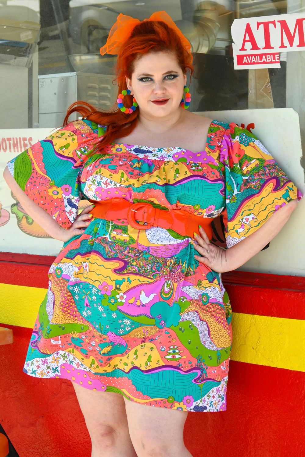 This easy, breezy lightweight cotton poplin dress features our popular landscape print in lovely emerald! It's the perfect summer dress, with on-seam pockets, and can be worn loose or paired with a fun belt! This fress is designed to fit a bit loose, and that's why measurements are a bit larger than most of our dresses. The most important measurement here is the hip one.