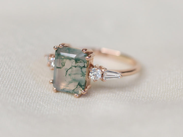 - 9mm x 7mm emerald cut moss agate center stone