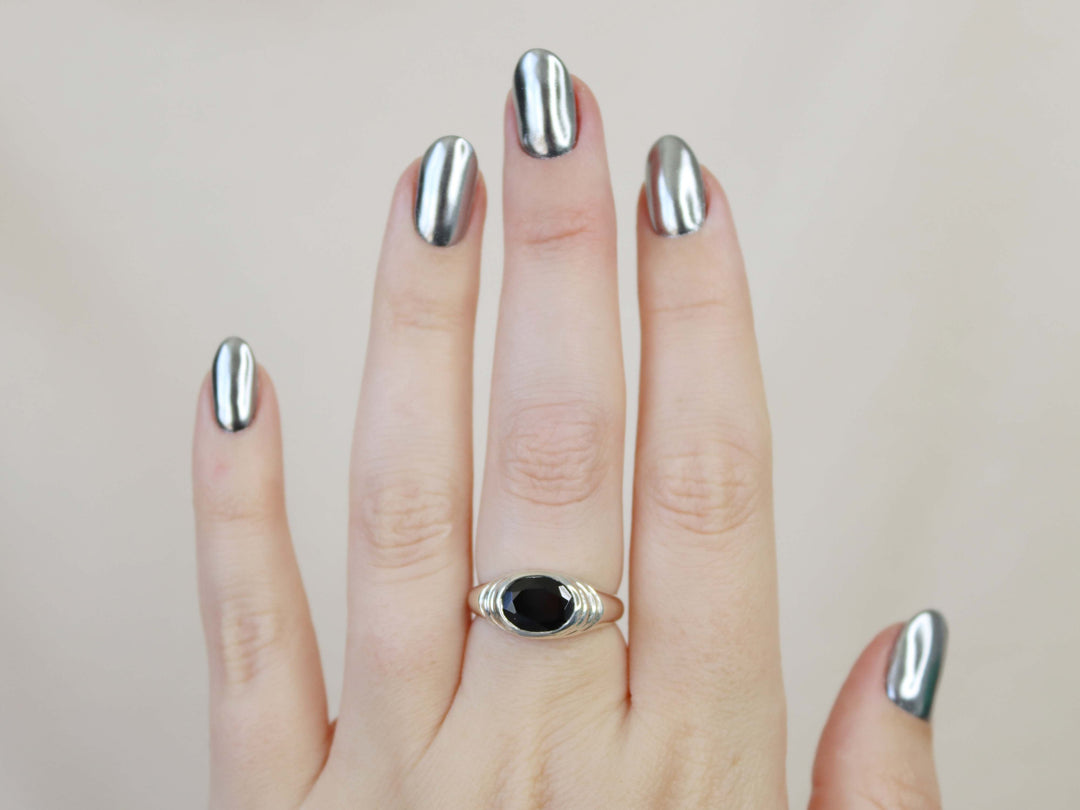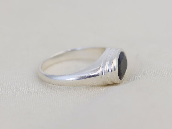 - solid signet ring with bezel set 10x8 oval faceted black spinel