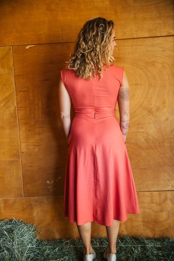 Linen / rayon blend, 55% Linen 45% rayon. In a bold sunset orange pink color